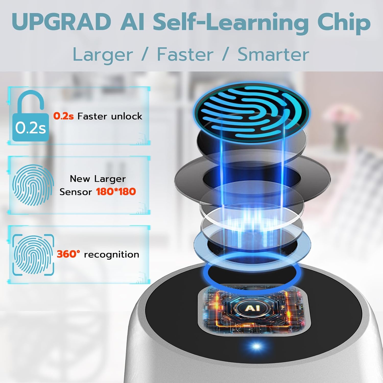 Supports 20 different fingerprints.Faster: Quickly unlock in 0.2s.Larger fingerprint module: 360° self-recognition.AI self-learning chip: The more you use it, the faster it unlocks.Safer: Fingerprint is stored locally on the lock, no need to worry about privacy issues