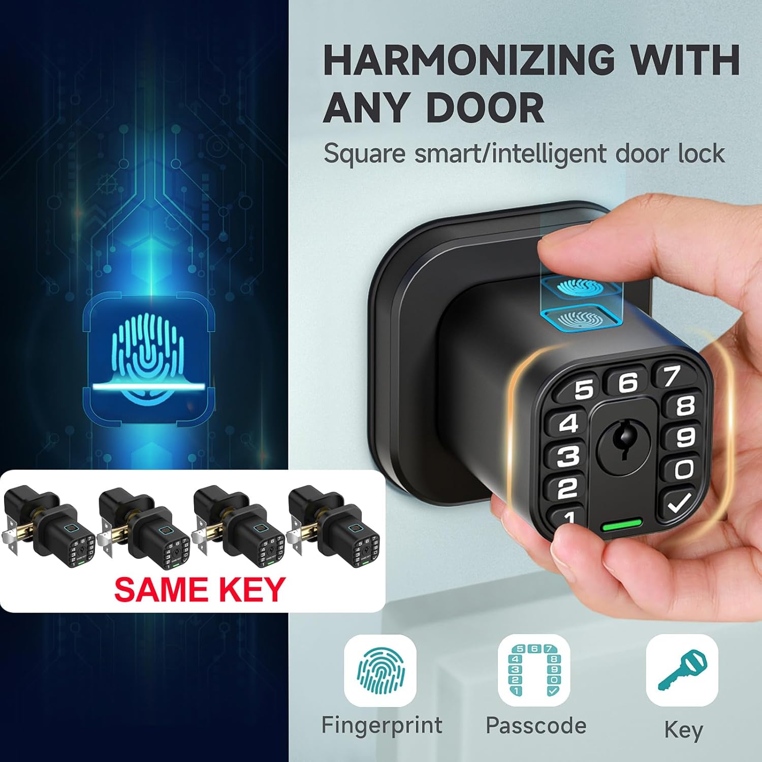 [HARMONIZING WITH ANY DOOR] The four locks included in the package share identical keys, offering convenient access. This square fingerprint door knob lock features an elegant design with rounded edges and an illuminated keypad, ensures ultimate grip comfort for you, upgrades your door’s style. Unlock your way with fingerprint, keypad, or key. Perfect for entryways, bedrooms, garages, and offices.