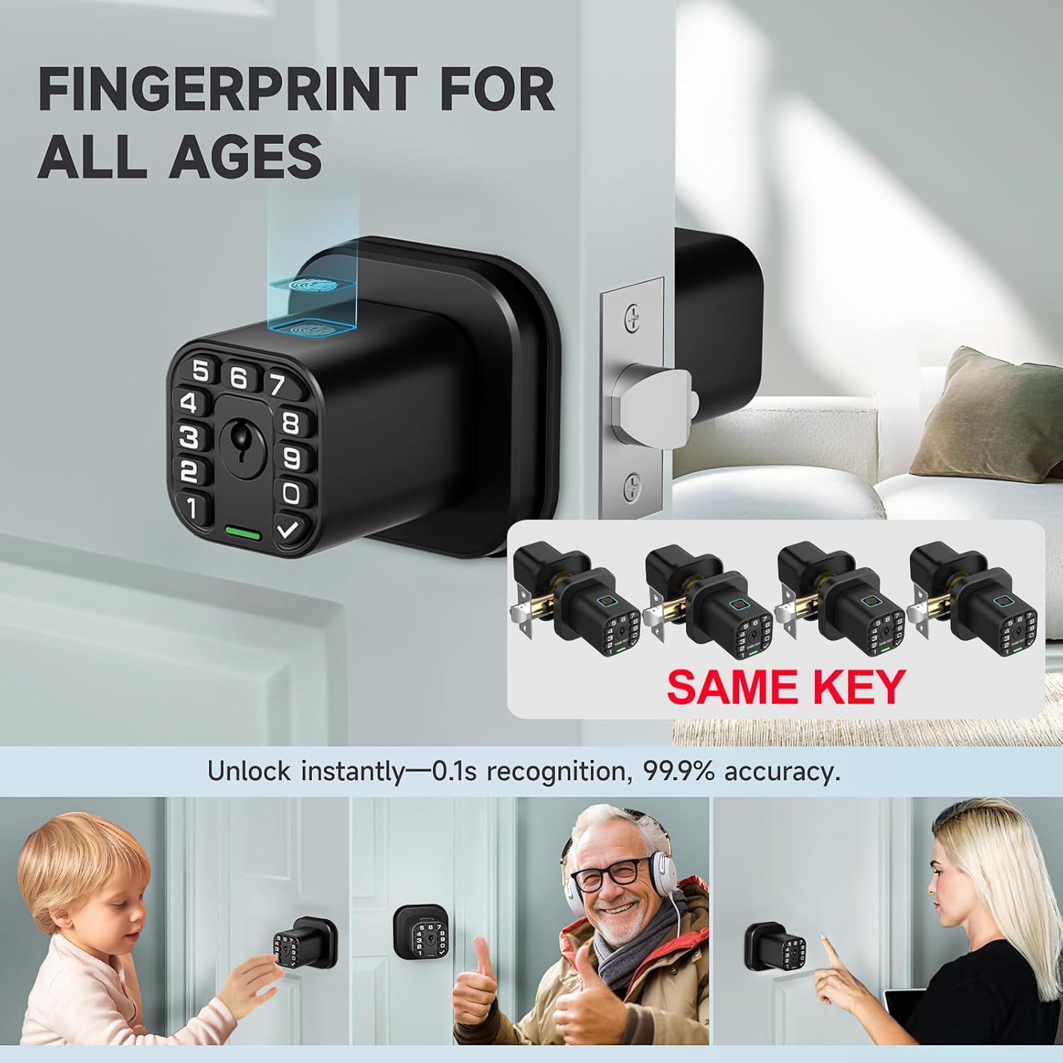 [FINGERPRINT FOR ALL AGES] This biometric keypad door knob stores up to 100 fingerprints and features advanced AI learning technology that continually enhances its sensitivity and accuracy. Whether for kids or seniors, it recognizes each fingerprint with precision, ensuring seamless access for family members and trusted guests.