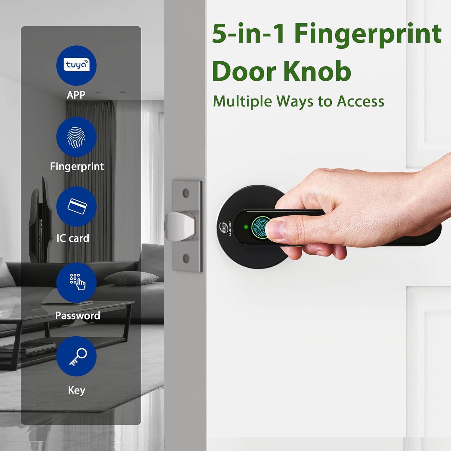 Fingerprint Door Lock, 5-in-1 Smart Door Knob with Handle, Biometric Keyless Entry with Keypad and App for Bedroom Home Office Doors