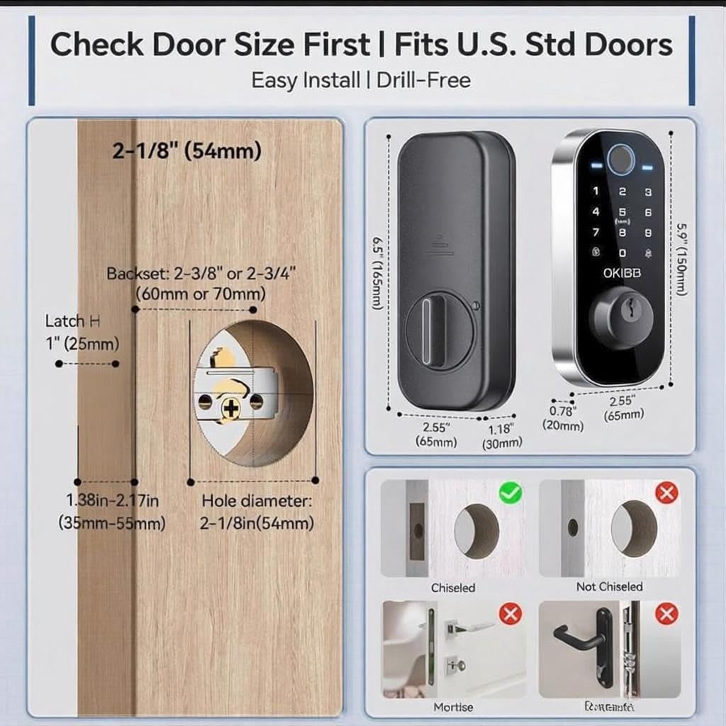 Step into the smart home era with this advanced fingerprint smart door lock, your family’s trusted guardian for secure and key-free entry. Designed to fit perfectly on most standard front doors, it enhances your home’s security and style. Experience ultimate convenience with built-in Wi-Fi that connects directly to your home network, eliminating the need for a separate hub. It offers five keyless entry methods—fingerprint, Fob card, app control,touchscreen keypad, and mechanical key—to meet all your needs. With a massive capacity to store up to 100 fingerprints and 100 unique passcodes, this lock is ideal for managing access for large families, rental properties (apartments, offices, or hotels), and frequent guests. Take full control from anywhere with the dedicated smartphone app. Remotely unlock the door, generate secure one-time passcodes for visitors, or create scheduled access codes for housekeepers or tenants directly from your phone.The app provides comprehensive remote management, allowing you to set user permissions and review a detailed history of all lock activity. Enjoy total peace of mind with the customizable auto-lock feature (5-60 second delay). It automatically secures the door behind you, eliminating the worry of whether you remembered to lock it. For added convenience, one-touch locking on both interior and exterior panels lets you secure the door effortlessly, even when your hands are full. For enhanced safety, the app sends an instant alert to your phone if the door is left ajar. Built for reliability, the lock boasts an IP54 weatherproof rating to withstand harsh elements like rain, dust, and extreme temperatures. Your security is reinforced with anti-peeping technology (for discreet code entry) and anti-pry lock technology, while all data is protected by advanced encryption. For ultimate assurance, we recommend ensuring the product meets rigorous standards like ANSI Grade 2 certification for residential security.