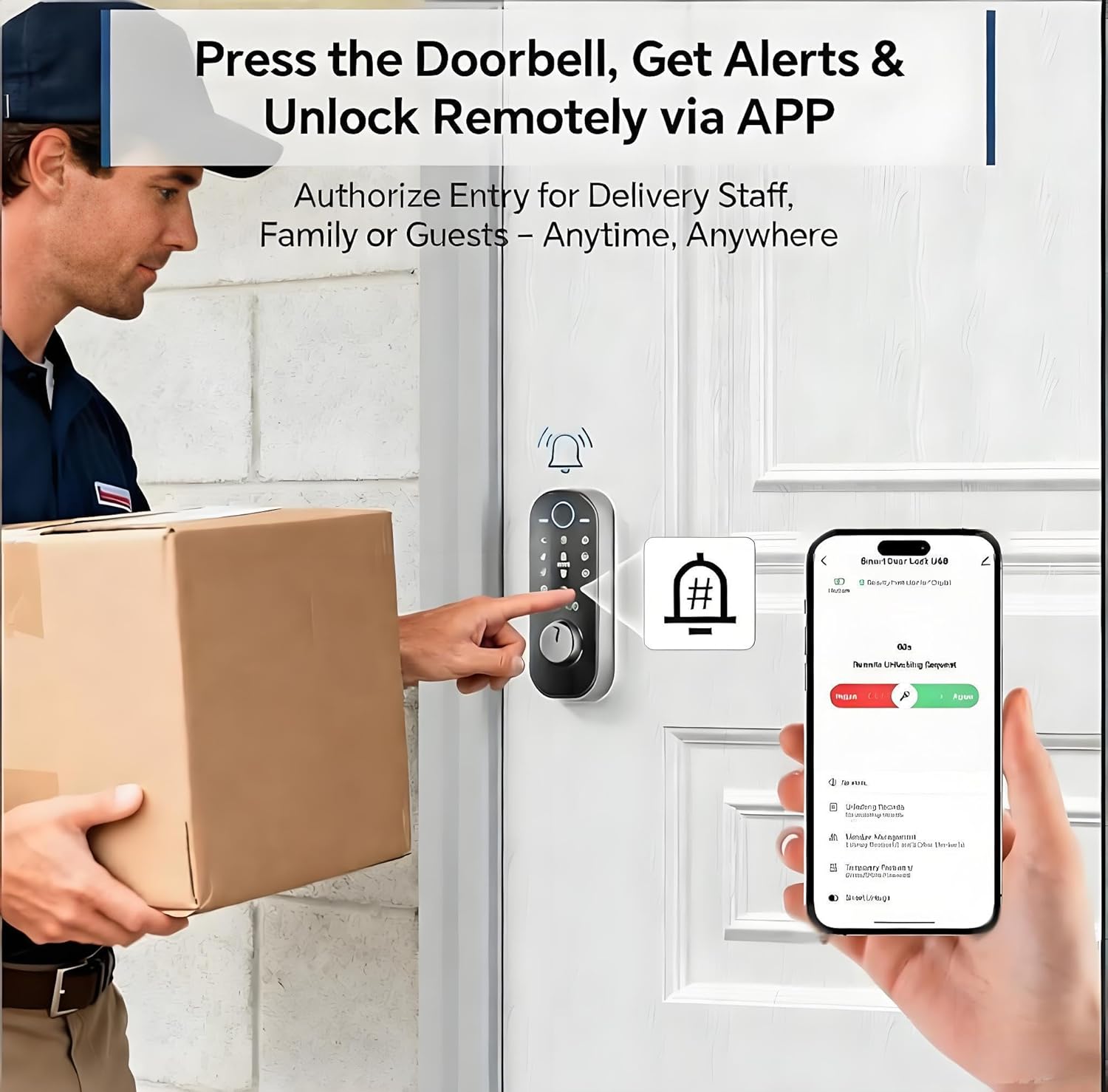 Experience complete smart door lock control directly from your phone:Grant unique, temporary, or recurring passcodes for house sitters, guests, or tenants, and provide keyless entry instantly when the doorbell is pressed. Track entry logs in real-time and members come returns home the door lock will send a notification.Perfect for Airbnb hosts and families, you can manage all users, ensuring secure and convenient access for everyone.