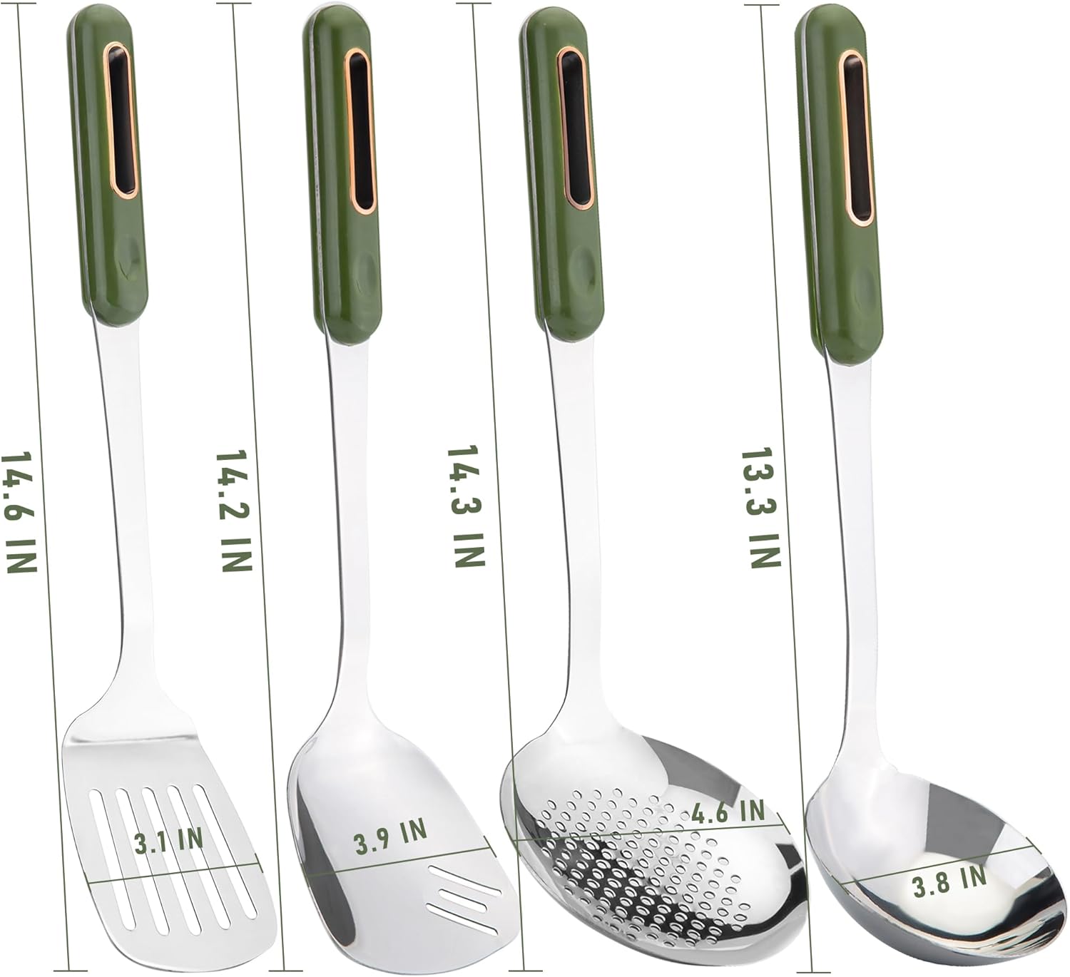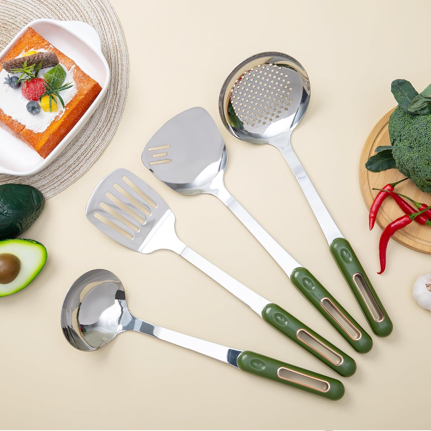 【Design of the Kitchenware Set】 : Green handle is ergonomic, durable and heat-resistant. Can be easily turned and cooked to help you make delicious dishes