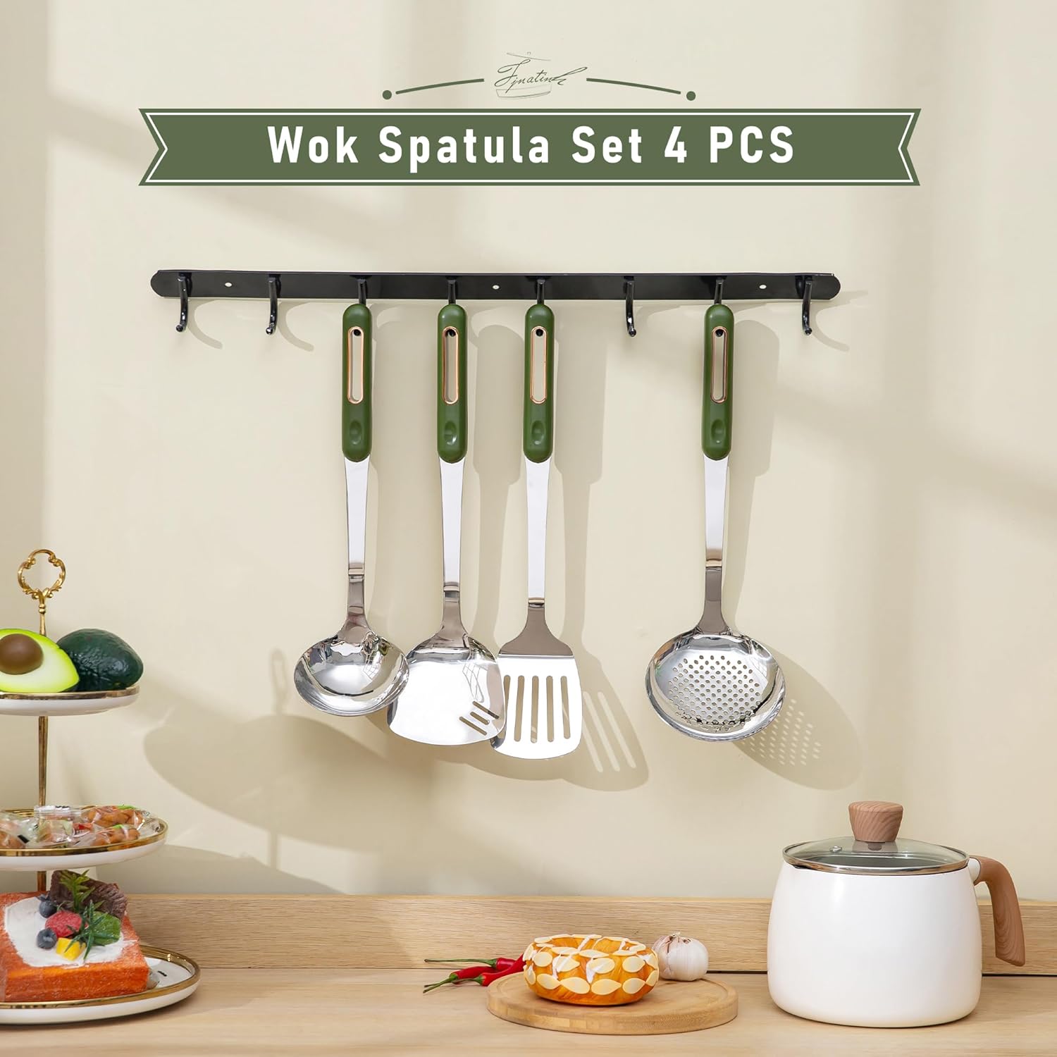 【Wok Spatula Material】: 201 stainless steel & green handle, durable, easy to clean, not easy to have dents, cracks, rust or fall off
