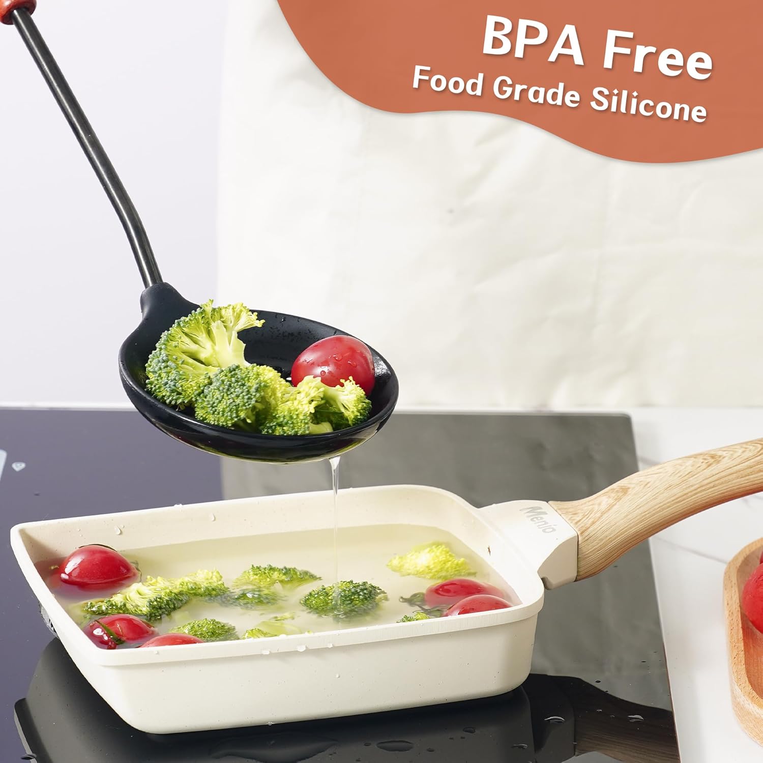 Product Dimensions: spatula:15″*4.1″,ladle:13.8″*3.5″,skimmer ladle:14.6″*4.3″,slotted spatula:14.9″*3.5″