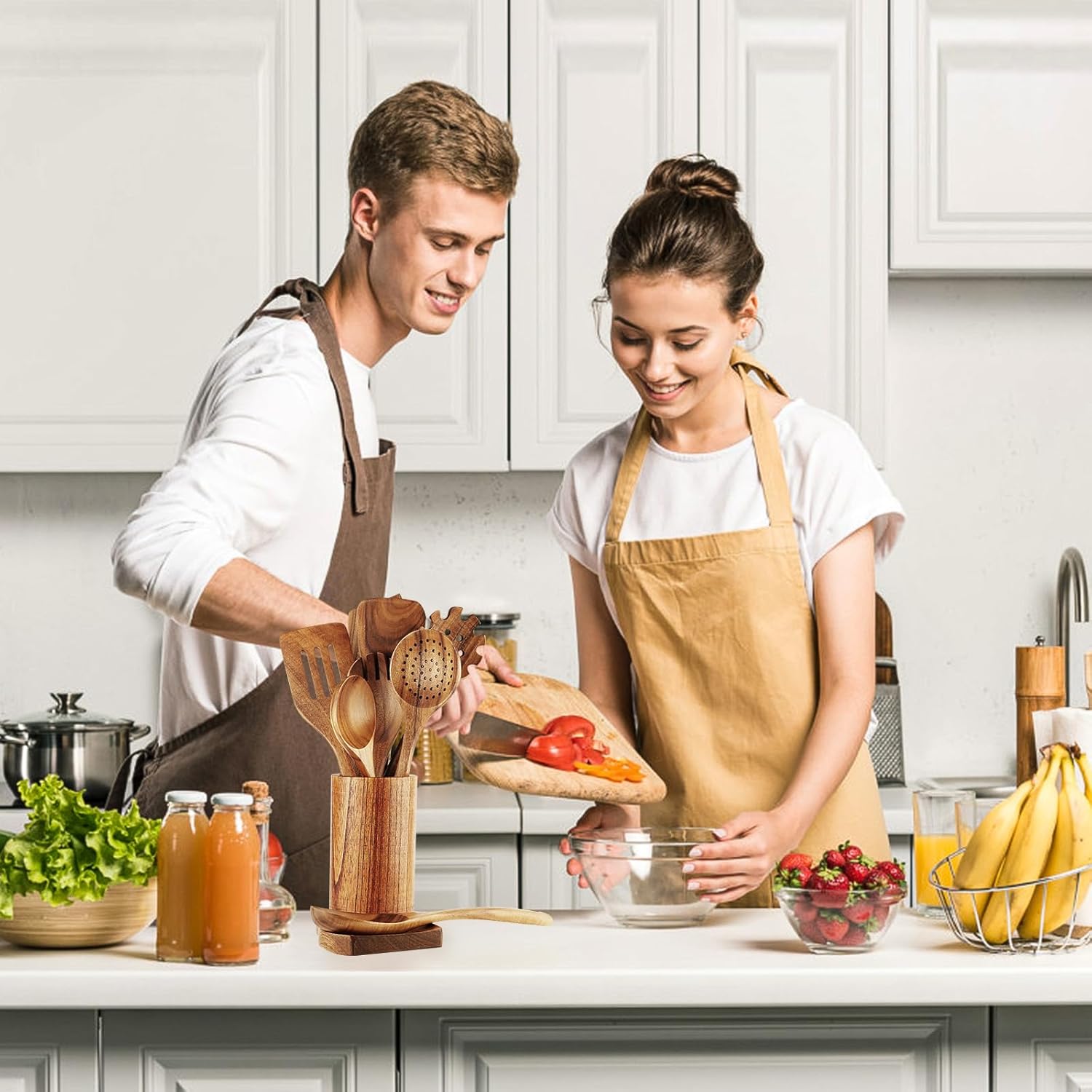 10 Pcs Cooking Utensils Set: Wood kitchen utensils that features all the essential cooking tools including a flat spatula, fried spatula, slotted spatula, kitchen utensil holder, spoons rest, strainer spoon, salad fork, salad spoon, mixing spoon and pasta spoon.Meeting all your cooking needs, durable solid Non Stick kitchen utensils.