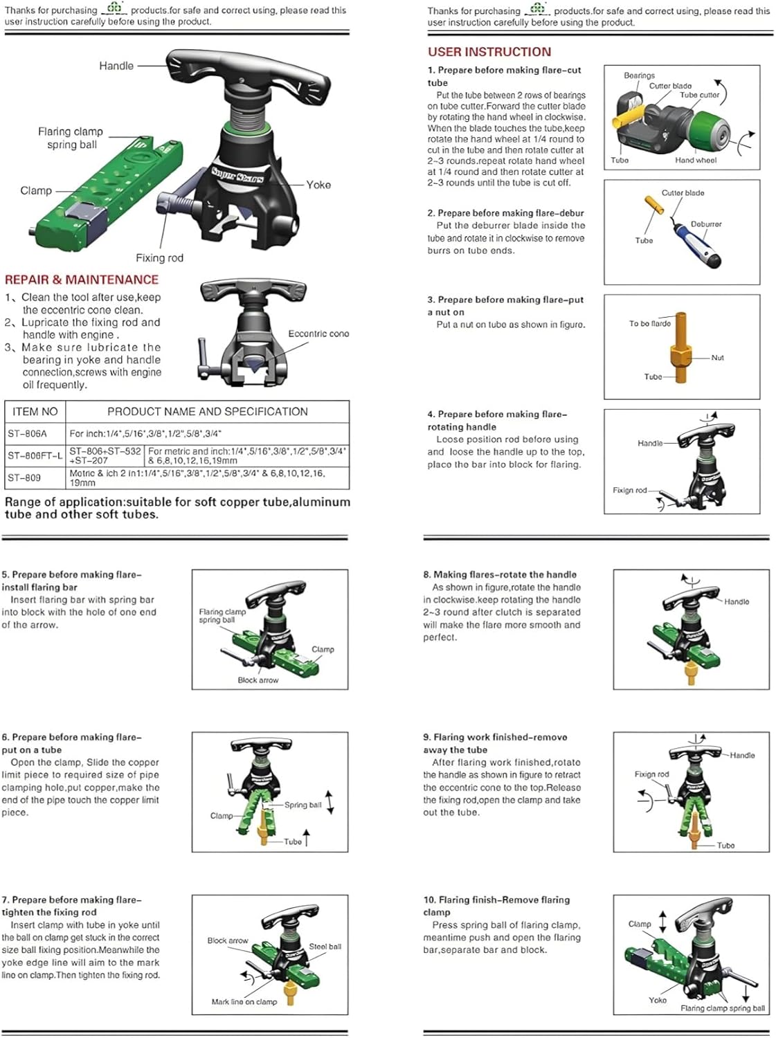 [Versatile Applications] Our flare kit tool is perfect for HVAC/R installation, air conditioners, air heaters, and refrigerators, maintenance, and repair work. It can swage tubing with diameters of 1/4 “, 5/16”, 3/8 “, 1/2”, 5/8 “, 3/4”