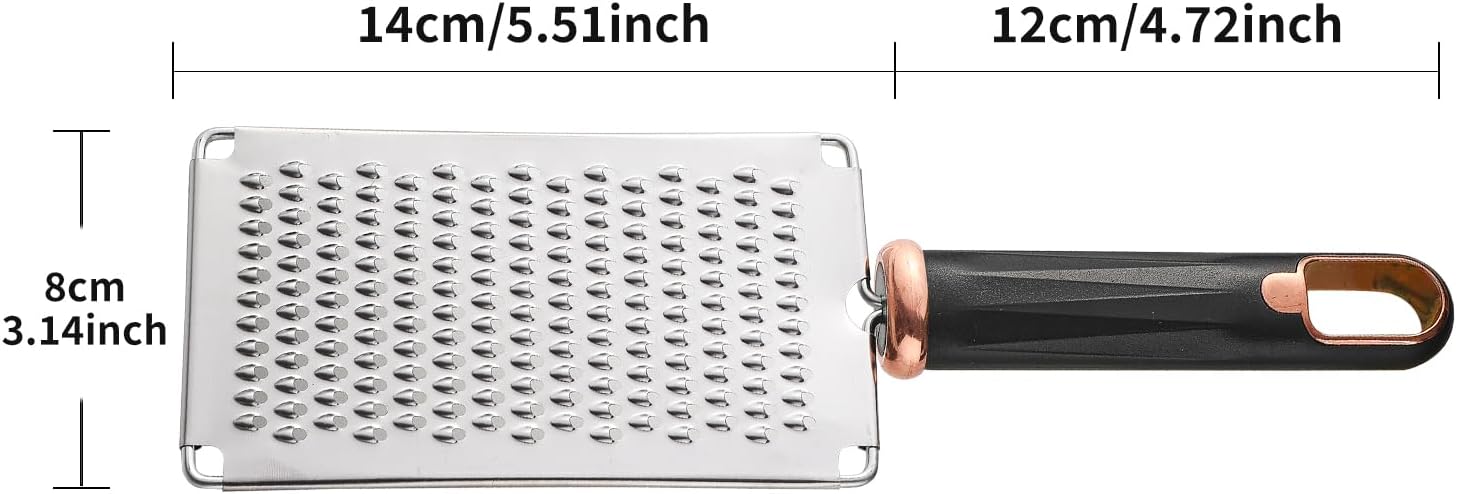 【Beautiful & Practical】The grater has a simple and elegant appearance design, with a silver stainless steel panel and a black handle, and rose gold decoration at the joint, which makes it practical and adds a sense of fashion to your kitchen, allowing you to enjoy a wonderful experience during the cooking process