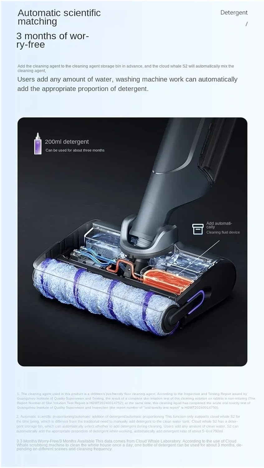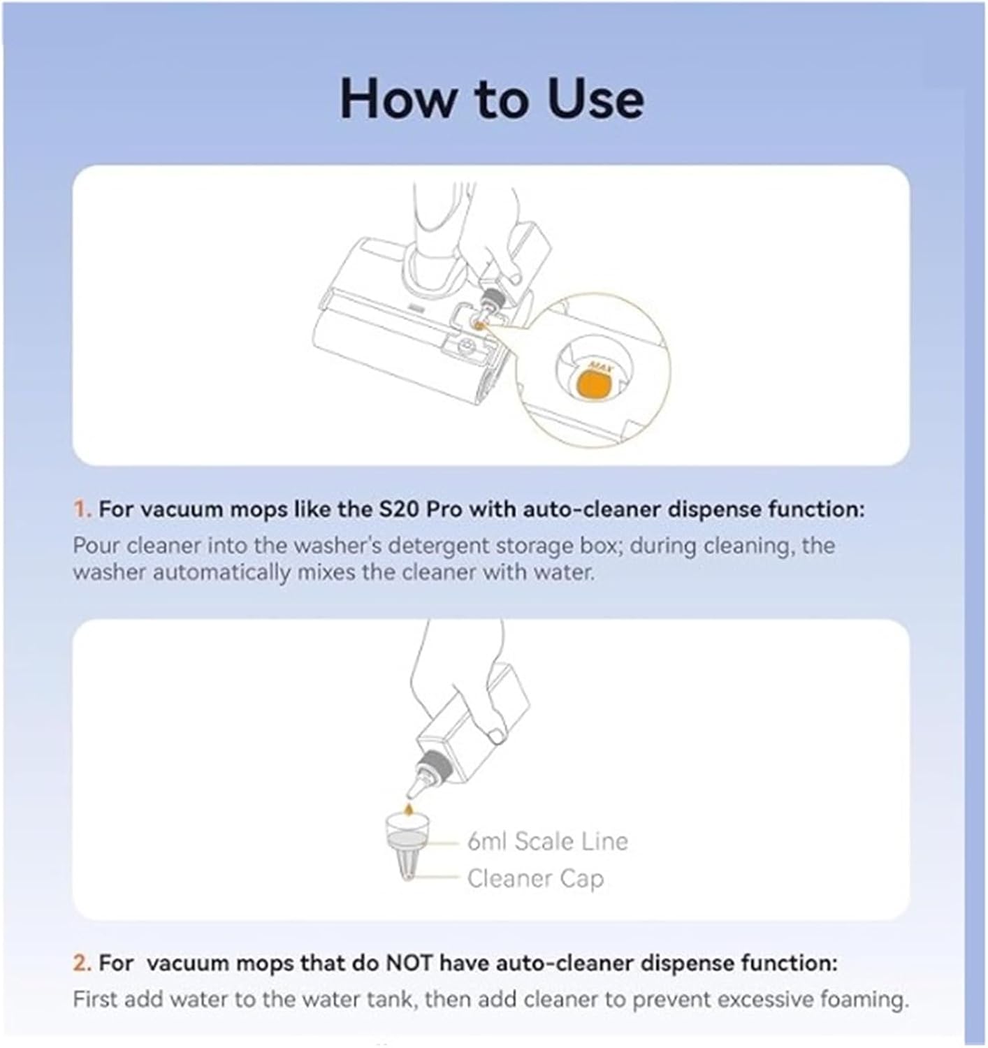 Concentrated Formula: One bottle of cleaning solution can be diluted for multiple uses, and the S20 Pro effectively uses about 5-6 ml of detergent per cleaning, so one 200 ml bottle provides up to three months of cleaning time.