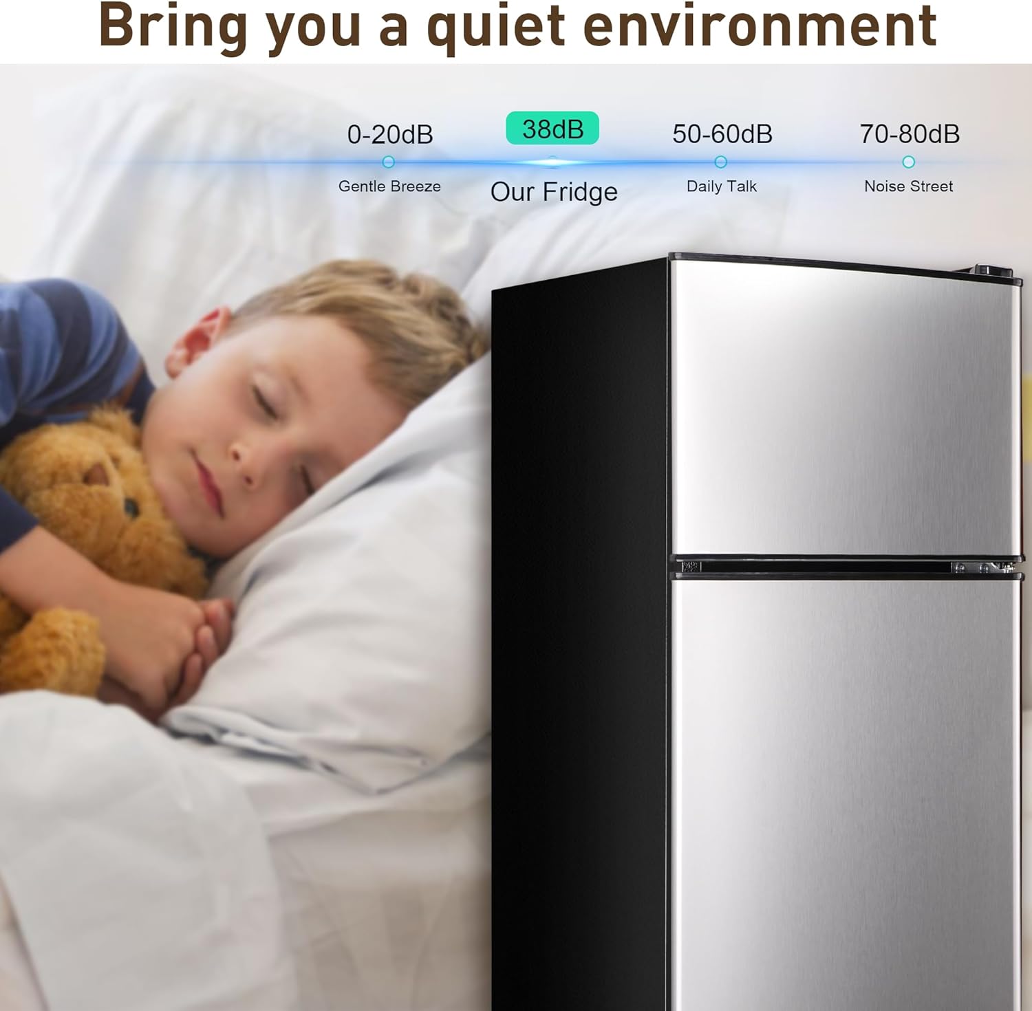 🧊 [Compact Size and Large Capacity] This mini fridge for bedroom has a small footprint and large storage space. Measuring 16.7*17.5*40.1 inches, it has a total capacity of 4.0 cu. ft. including a larger and deeper 1.2 cu.ft. freezer section and 2.8 cu.ft. freezer section. The refrigerator has a sleek and textured look that suits a variety of living scenarios.