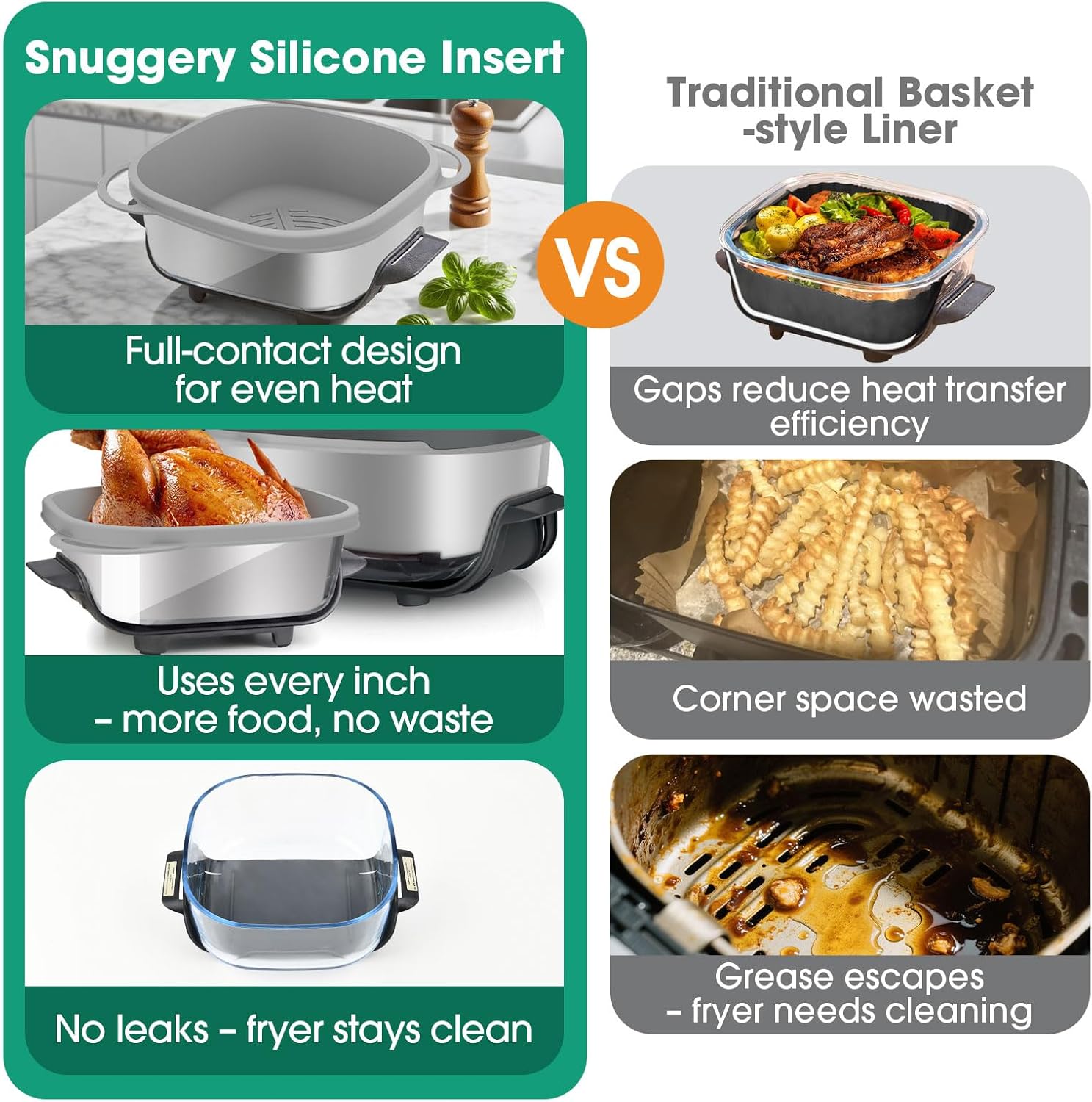 Full-Coverage Design Maximizes Capacity: Unlike traditional narrow basket liners, this full-coverage silicone insert covers the entire fryer bottom, expanding usable space and allowing you to cook more food evenly and efficiently