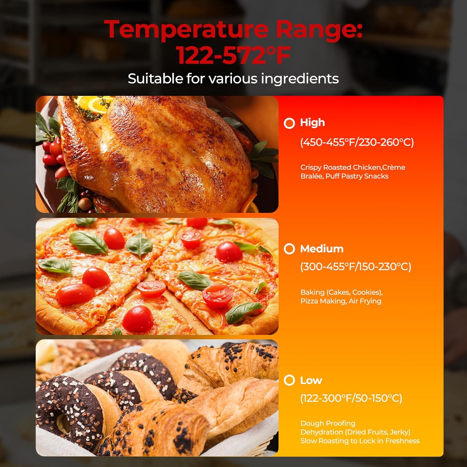 【122-572℉ Wide Temp Range + 120-Min Timer】 With a temperature adjustment range of 122°F to 572°F, this commercial oven meets all your cooking needs. Paired with a 120-minute adjustable timer, it allows precise control over cooking time and temperature. Whether you’re baking cakes, bread, donuts, pizza, or roasting chicken, beef, fish, this oven delivers flawless results every time with minimal effort