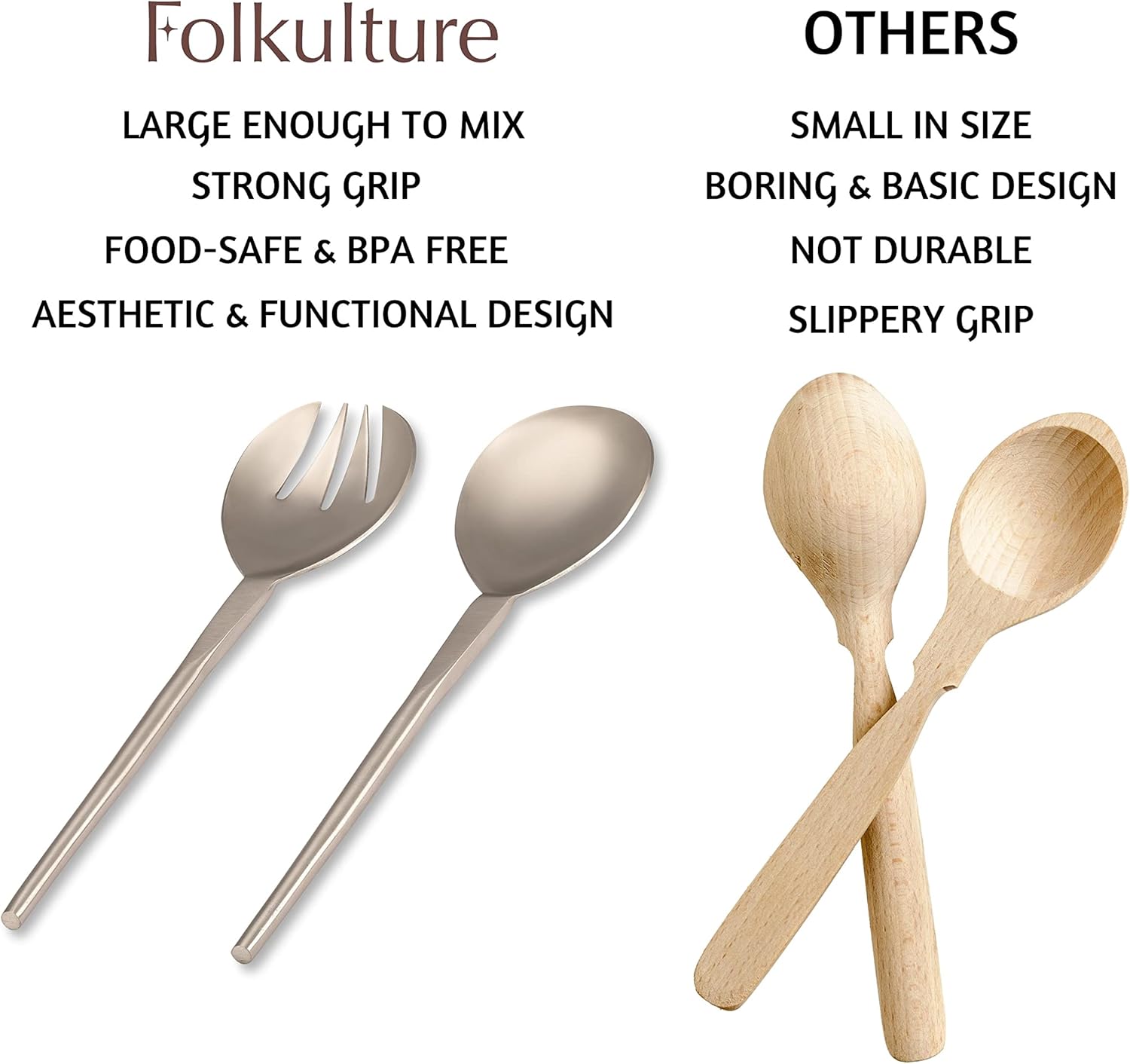 UNIQUE DESIGN – The salad tongs or serving set have ergonomically designed wide handles that makes for a comfort grip. It is heat resistant and stays cool while cooking, serving or mixing. The shape of these serving spoons and salad forks make them ideal for large salad bowls or serving bowls.