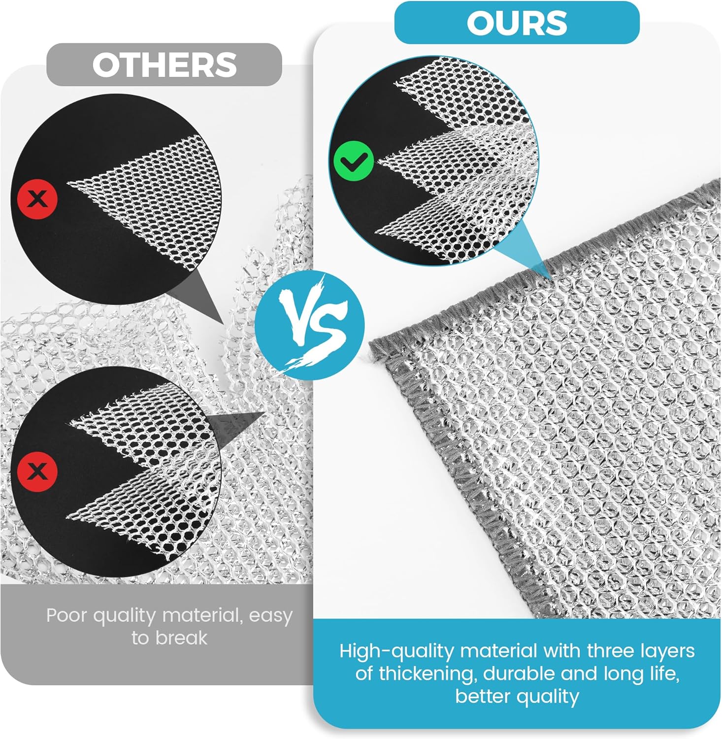 Reusable: Our scratch- non scratch wire dishcloth rag is a reusable washed rag This steel wool scrubber undergoes special treatment for enhanced durability, capable of withstanding frequent use and cleaning. Additionally, it is easy to rinse after cleaning, The three-layer thickened cleaning effect is more pronounced, quickly releasing moisture and drying, leaving no odor. We’ve also added hooks that can be hung on the wall after use, saving space in the kitchen and making them easy to drain and clean. providing a convenient and efficient solution for kitchen cleaning.