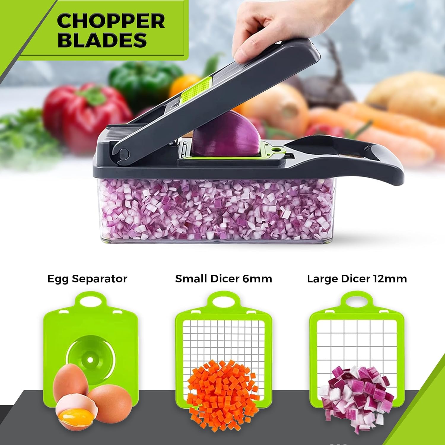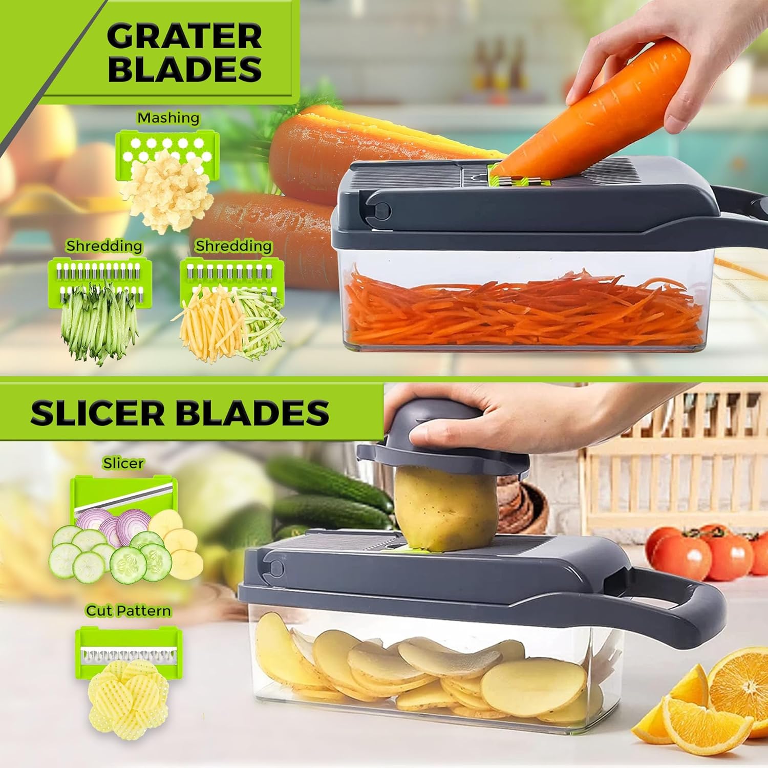 14-in-1 Chopper – Crafted with top-notch materials, this multifunctional vegetable chopper features food-grade components. The sharp blades swiftly chop a wide variety of fruits and vegetables, making it an essential tool for any kitchen.