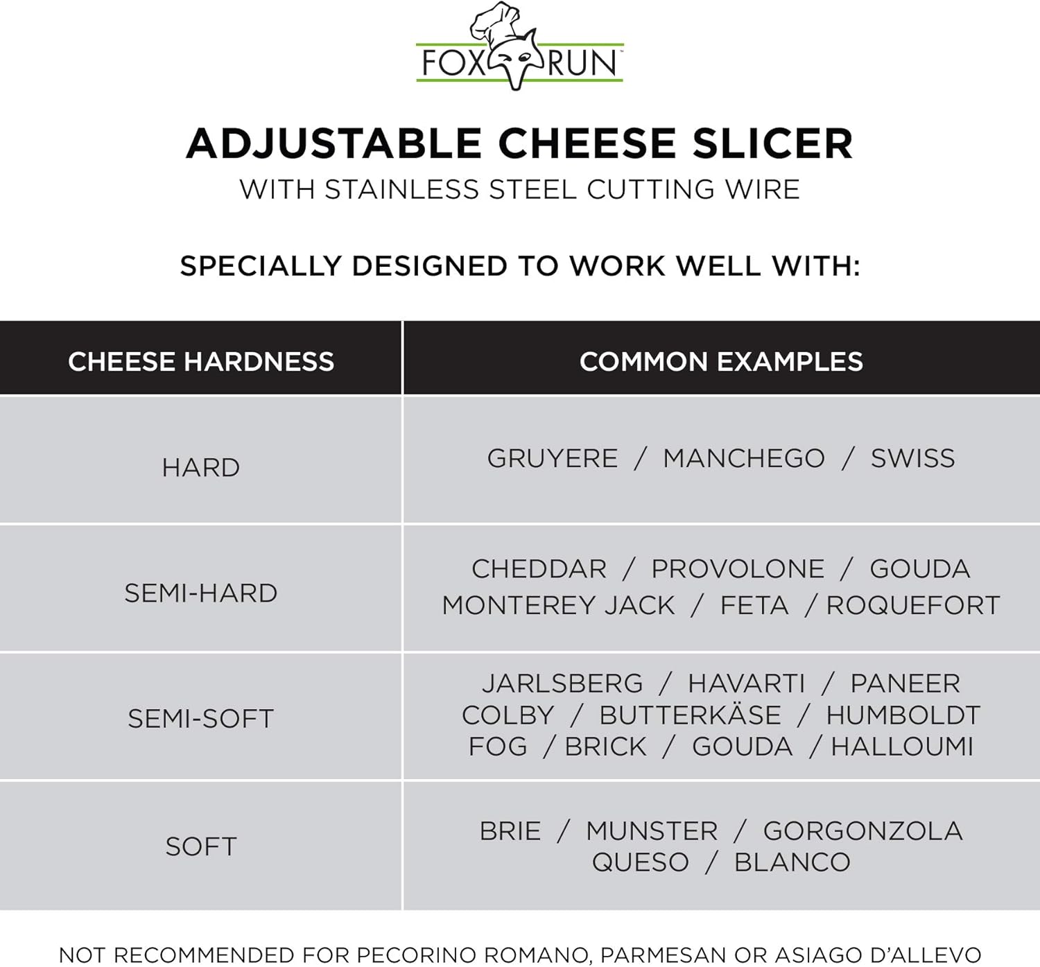 EASILY HANDLES CHEESE BLOCKS UP TO 3. 5” WIDE: Adjust the slicer to give you wafer thin slices or nice, chunky slices up to ¼” thick. No matter the thickness, the Fox Run Brands Slicer handles the cheese with ease