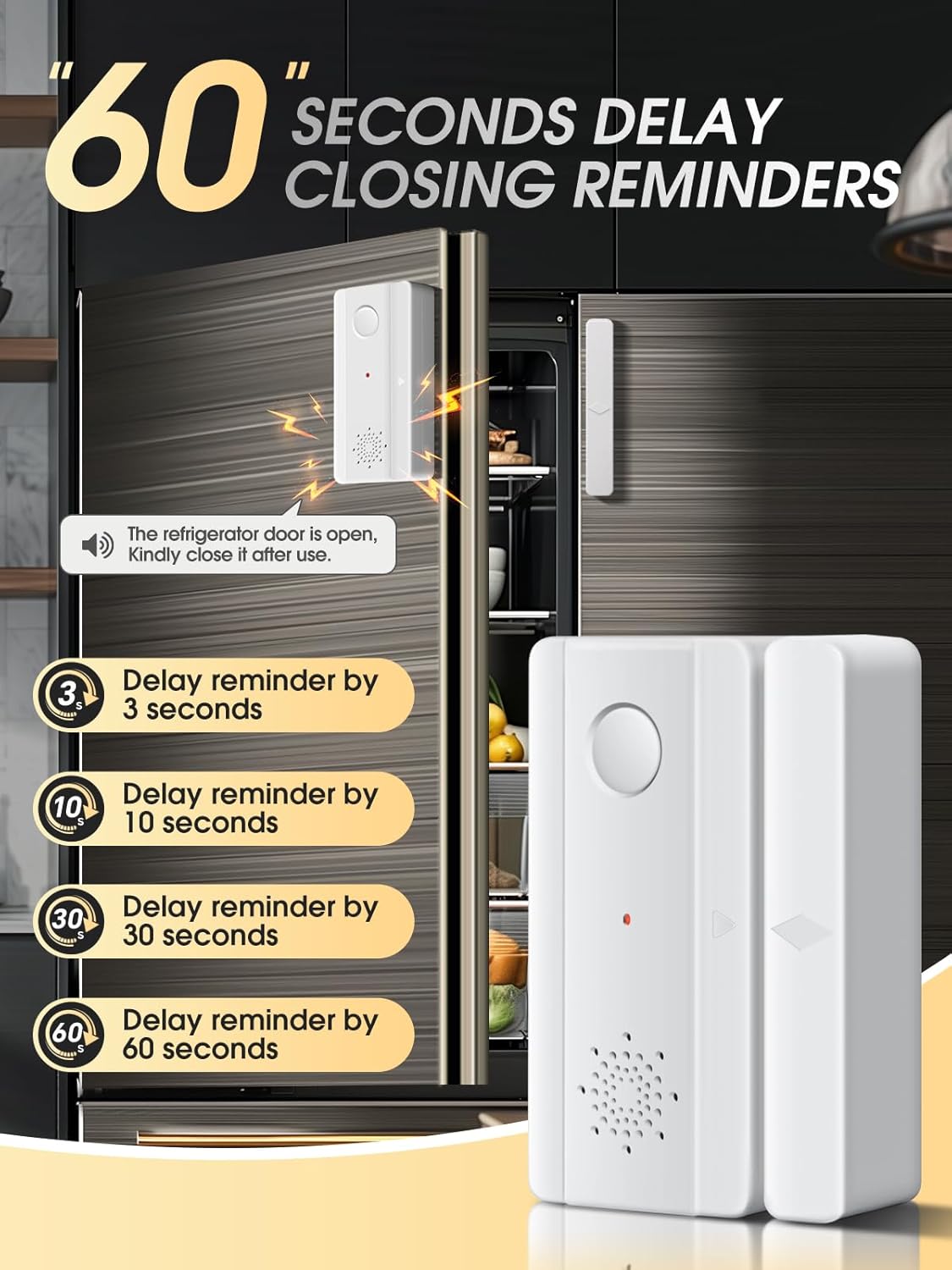 When your freezer or refrigerator door is left open or partially open, the voice door sensor will remind you to close it, helping to prevent food waste. Children often leave the refrigerator door open, causing the compressor to run hotter, which means it takes longer to cool down and consumes more electricity.Unlike regular timers or alarms, the voice door sensor features a delay reminder function. You can set it to issue a voice prompt after the door has been open for 0, 3, 10, 30, or 60 seconds. You will then have 59 seconds to remove items from the freezer or refrigerator.The voice-activated door reminder has 5 adjustable volume levels, allowing you to adjust the sound according to the environment.The freezer and refrigerator door reminder is a standalone device. It comes with double-sided adhesive and 3 AAA batteries, which can last up to 12 months.We recommend keeping the alarm and mini sensor no more than 0.394 inches apart. The closer they are, the more sensitive the sensor will be.