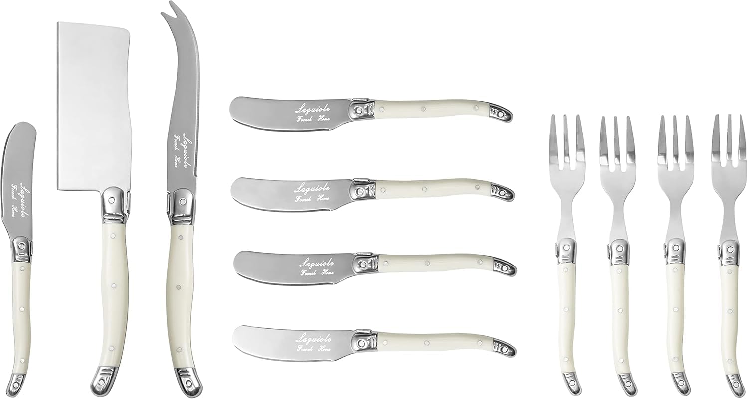 French Home Laguiole 11-Piece Charcuterie Utensil Set – Three-Rivet Ivory-Colored Handles with Iconic Bee Emblem, Includes Fork-Tipped Spear, Fork Set, Butter Spreader & More