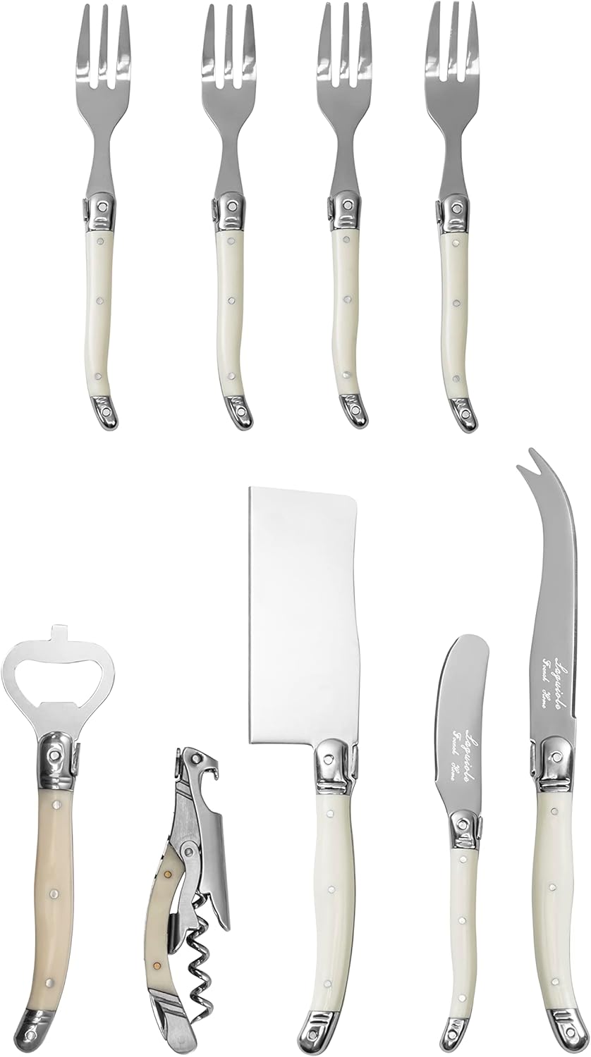 French Home Laguiole 9-Piece Charcuterie Utensil Set – Three-Rivet Ivory-Colored Handles with Iconic Bee Emblem, Includes Fork-Tipped Spear, Fork Set, Butter Spreader & More