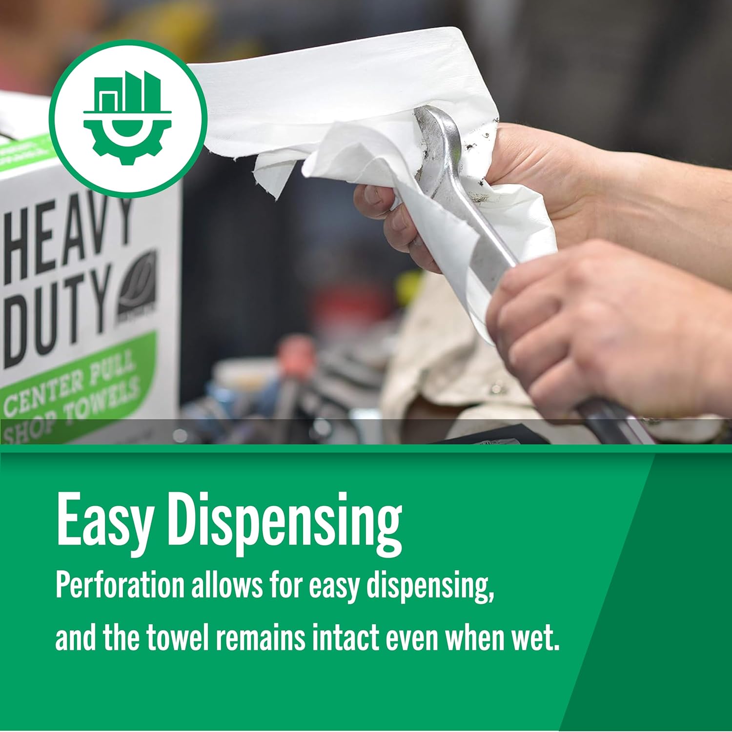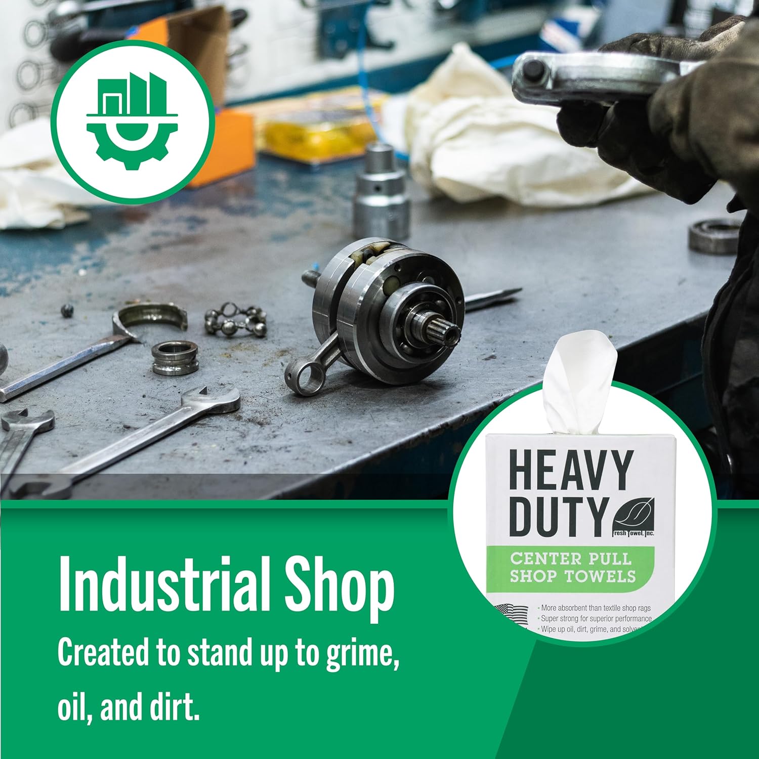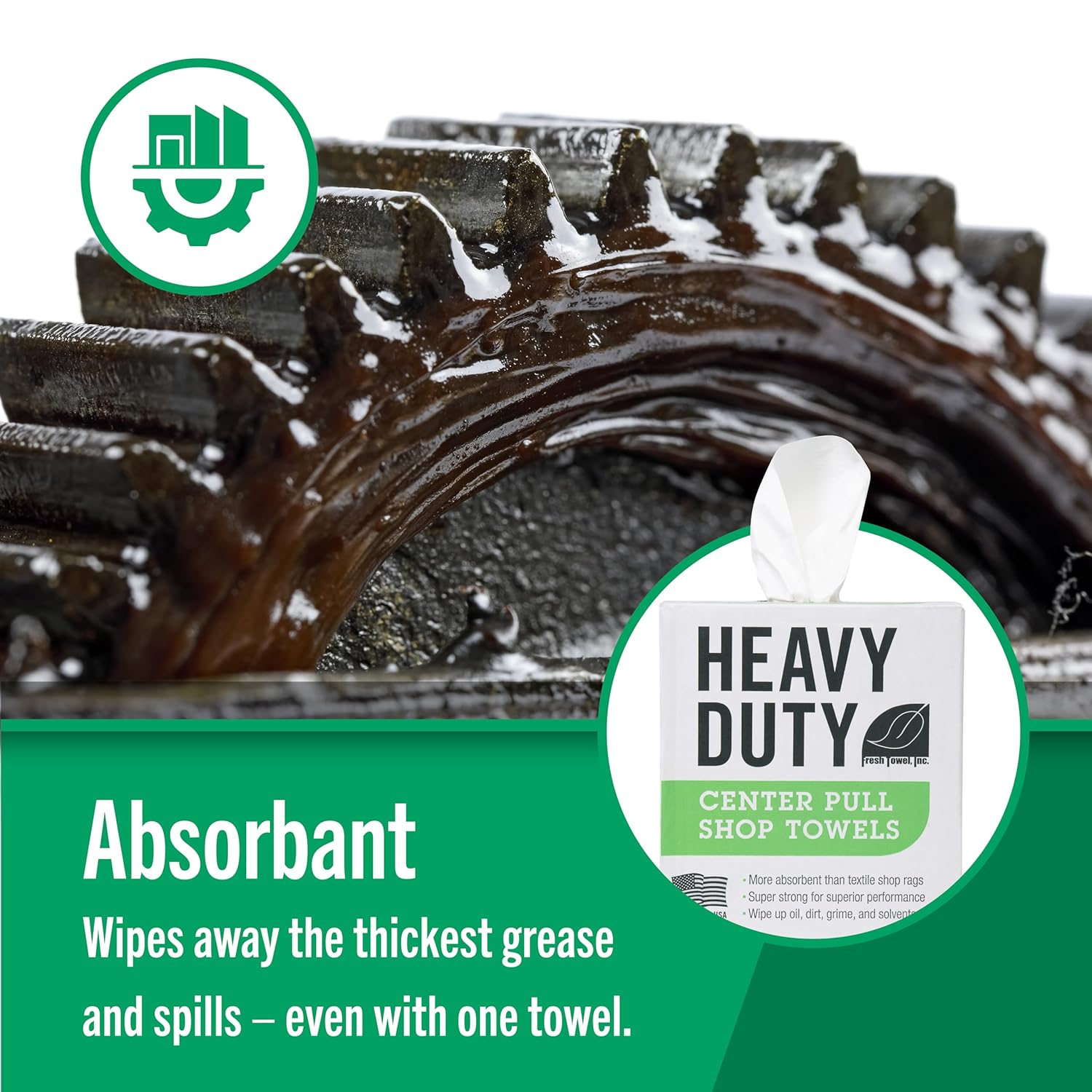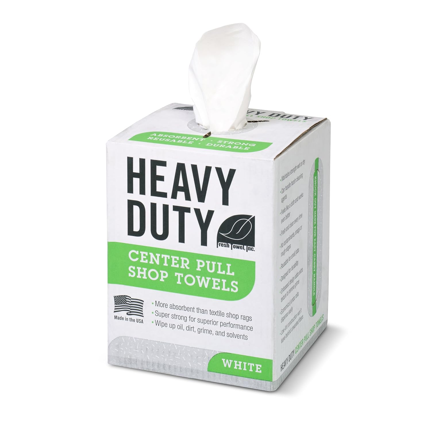 HEAVY DUTY DISPOSABLE SHOP TOWELS, 160 SHEET COUNT: Maximum strength, center pull shop towel rags for cleaning for superior performance to wipe up oil, grime, and solvents. These highest strength towels are designed for durability and to handle harsh cleaning agents. Tough as rags for heavy duty cleaning.