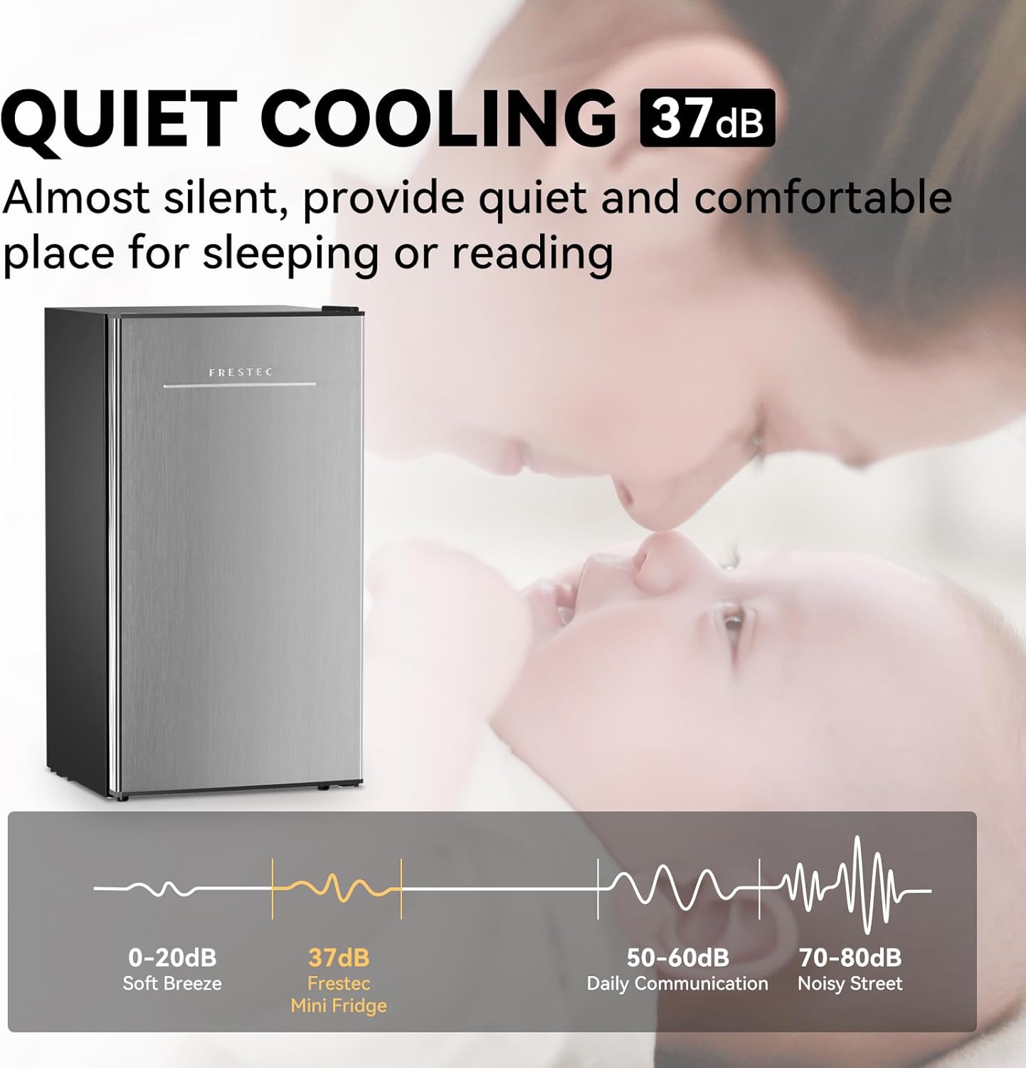Refrigerator Single Door Mini Fridge with Freezer, 4.5 Cubic Feet Frestec-Fresh Food, Healthy Life Metallic look and functional textured worktop,suits any household and blends with a variety of decorating scheme. Compact refrigerator uses R600a high-efficiency and low-energy consumption compressor, it only consumes 0.6Kwh of electricity per day, saving your energy bill while let you enjoy a healthy low-carbon lifestyle. Mechanical temperature adjustment ranges from 23′ to 50’Fahrenheit. One-touch Easy Defrosting System solve frosting problems by pressing one simple button. 4.01Cu.Ft fridge storage,0.49 Cu.Ft Light-degree Freezer storage. Come with 3 removable glass shelves to select your favorite combination. Crisper Drawer design keep fruits and vegetables fresh. Reversible door that can open from left or right. Low sound operation (37dB) is perfect for places where you don’t want a noisy appliance. Adjustment leg help to placed the compact refrigerator steadily on uneven grounds. LED interior lights turning on when you open the door for your convenience. Two wheels at the bottom of the small refrigerator, which makes it more convenient to move around. Comes with a ice tray,drain tray and 3 reusable storage bags as a bonus. Perfect for college dorm rooms, offices, garages, home bars,RV,campers. Specifications Color: Black/Sliver Capacity: 4.5 Cu.Ft Voltage: 115V/50Hz Fridge capacity:4.01Cu.Ft Freezer capacity: 0.49 Cu.Ft Package Includes 1 X Refrigerator 3 X Glass shelf 1 X Vegetable Crisper 1 X Power Cord 1 X Ice Tray 1 X Drain Tray 3 X Reusable Storage Bags 1 X User Manual