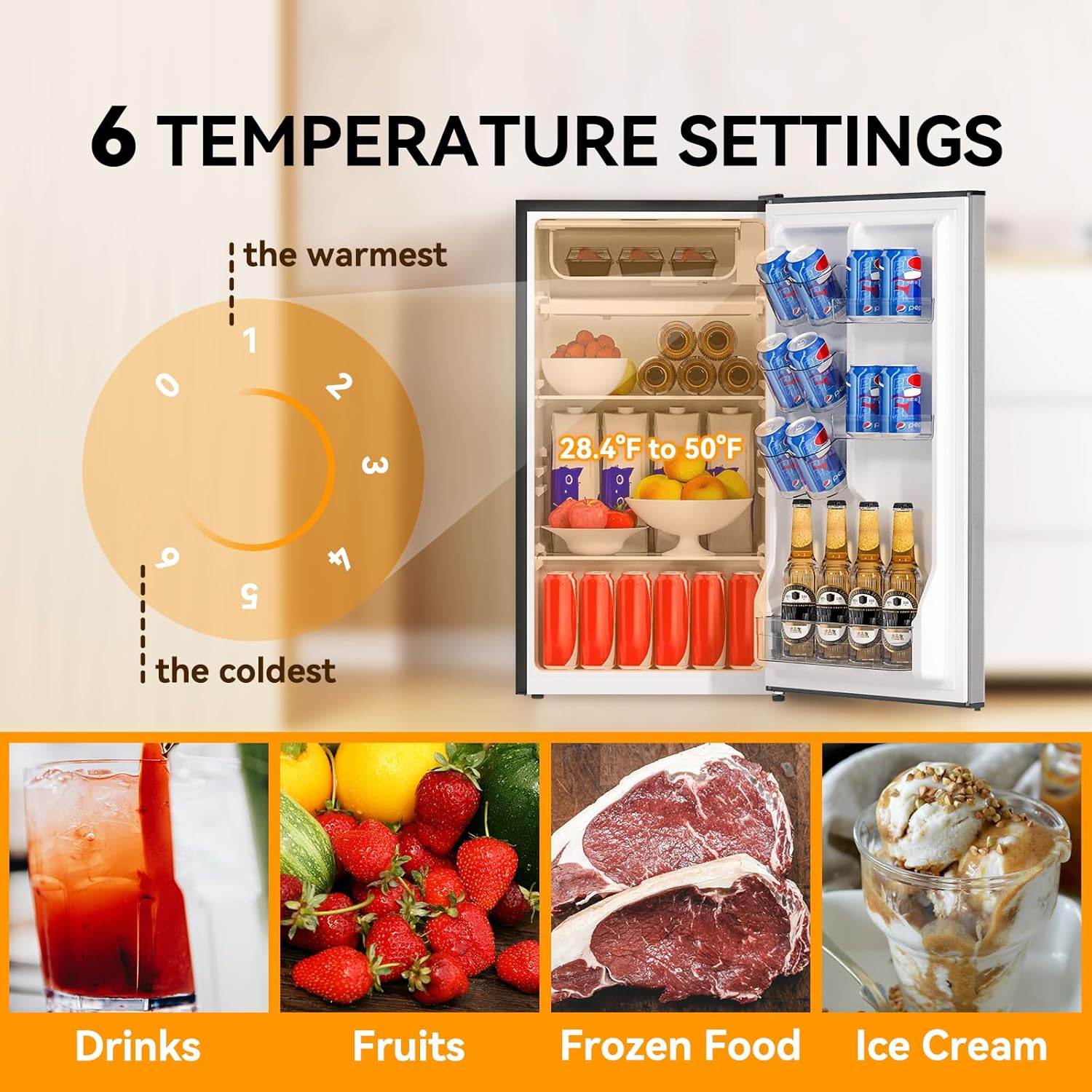 🍨 𝐒𝐌𝐀𝐋𝐋 𝐒𝐈𝐙𝐄 𝐖𝐈𝐓𝐇 𝐋𝐀𝐑𝐆𝐄 𝐂𝐀𝐏𝐀𝐂𝐈𝐓𝐘: This 3.2 cubic feet mini refrigerator (17.83″W x 16.73″D x 33.27″H) provides large capacity chilled storage which could store beverages, vegetables, fruits and snacks. Such a compact refrigerator can also fit in most spaces like kitchen, dorm, office or bedroom.