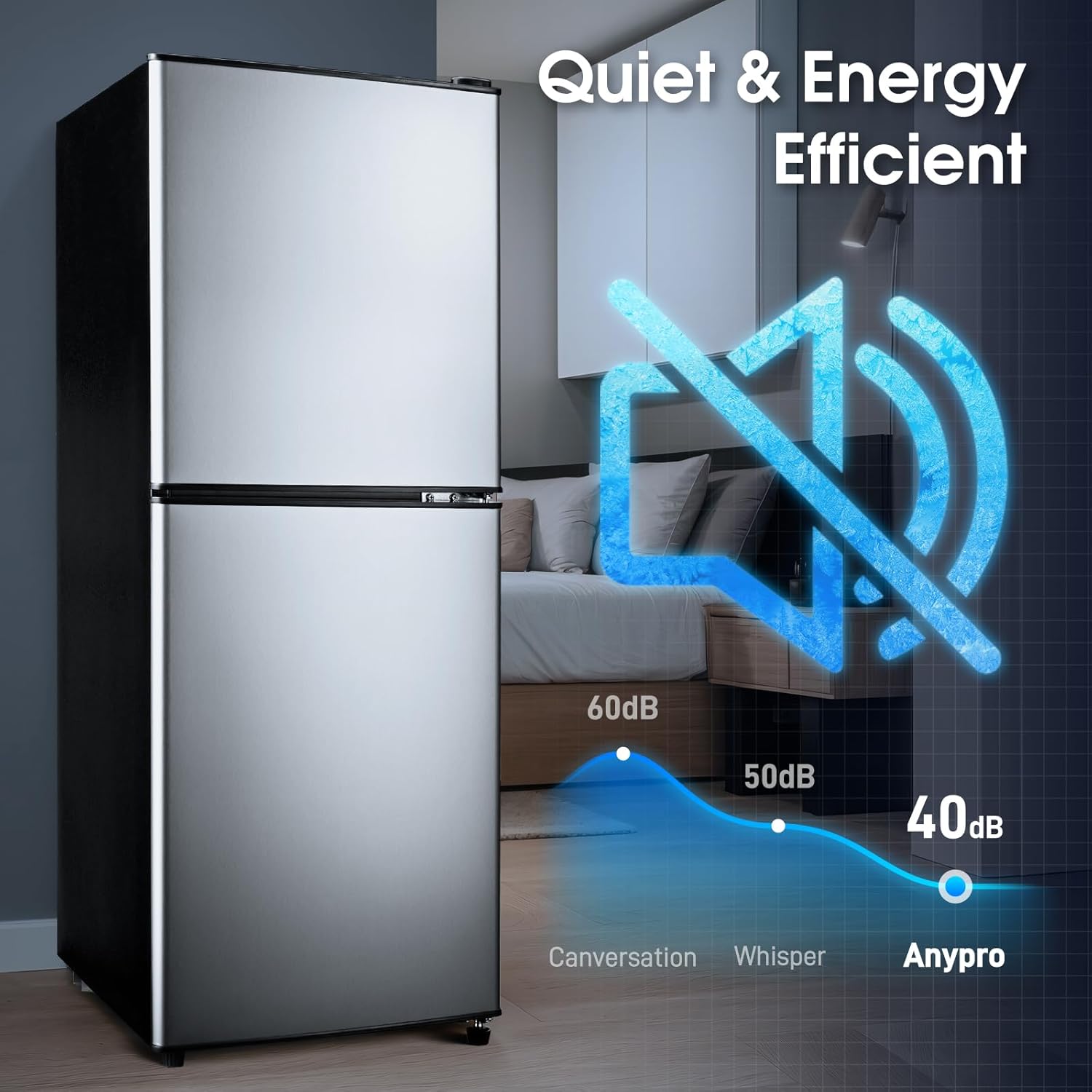 Versatile Temperature Control: Featuring 7 adjustable temperature settings, this refrigerator with freezer allows you to customize the cooling environment. The fridge compartment ranges from 41°F to 46.4°F, while the freezer can reach as low as -0.4°F. No matter what kind of food you need to store, including meat, eggs, milk, beer, coffee, vegetables, fruits and ice cream, the Anypro fridge ensures optimal freshness and flavor, making it ideal for students, families, and travelers.