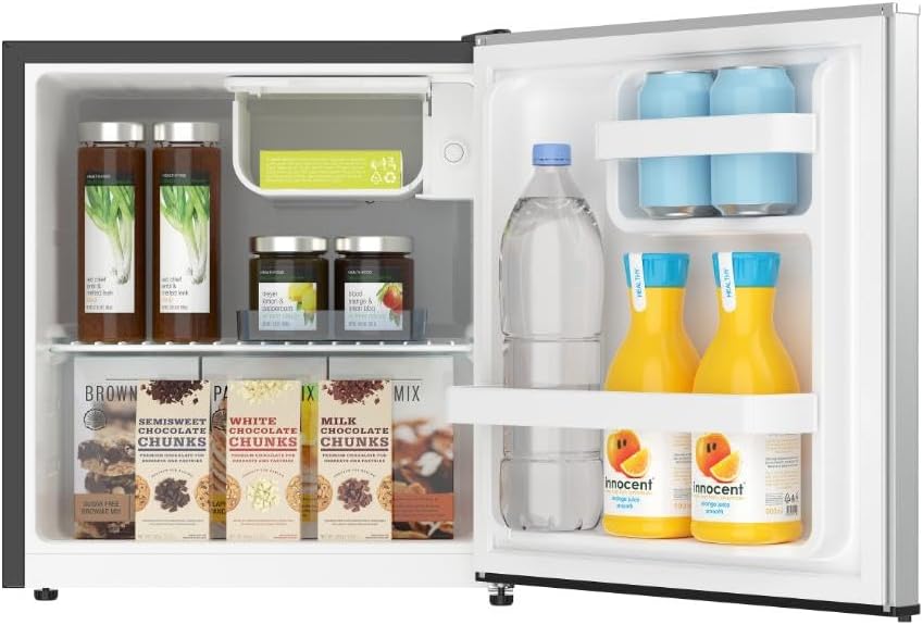 The Mini Refrigerator has enough room for your groceries and is compact enough to fit almost anywhere. It features an ice cube chamber freezer with a small freezing compartment, an ice cube tray and an integrated tall bottle holder. The slide-out shelf helps keep your items organized, and has a reversible door design. A sleek, stylish stainless steel finish, invisible door handle and clean lines blend nicely with any decor, and the efficient compressor cooling system ensures low energy consumption and is free from CFC.