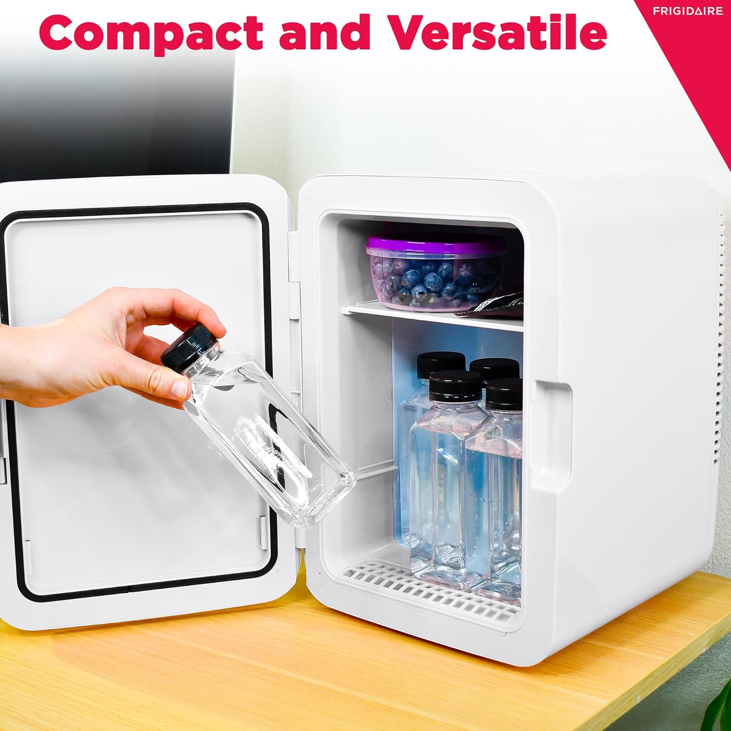 MINI FRIDGE, MAXIMUM CHILL. The Portable Personal Fridge keeps your food and drinks the perfect temperature while at home and on the go. The ultimate versatile cooler, this mini fridge goes from cooling to heating with just the flip of a switch. Cools up to 32°F below ambient temperature, and warms up to 140°F at an ambient temperature of 75°F. Compact space saving design and lightweight features make it easy to take with you anywhere, yet can still fit your needs; Removable shelf makes it easy to store milk, juice, yogurt, bottles, smoothies, cheese, fruit, coffee, soup, and many more home cooked meals or beverages. Perfect for personal spaces, bedrooms, offices, hotels, boats, carpools, soccer games, sporting events, backyard BBQ, pool parties and more! Conveniently plugs into standard home outlets and 12V car chargers so you can take with you anywhere you go. 100% Freon-Free and and cETL approved with advanced safety technology for long-lasting durability.