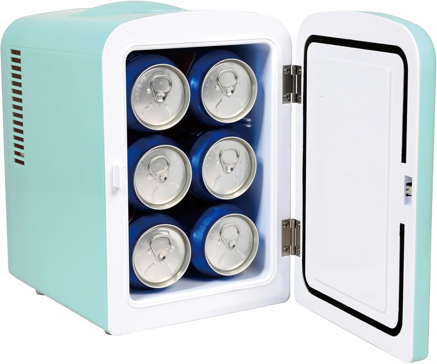4 Liter capacity chills six 12 oz. soda cans; interior is 5 x 5 x 7. 5 and includes removable shelf so you can store small items such as yogurt, fruit, milk, bottles etc