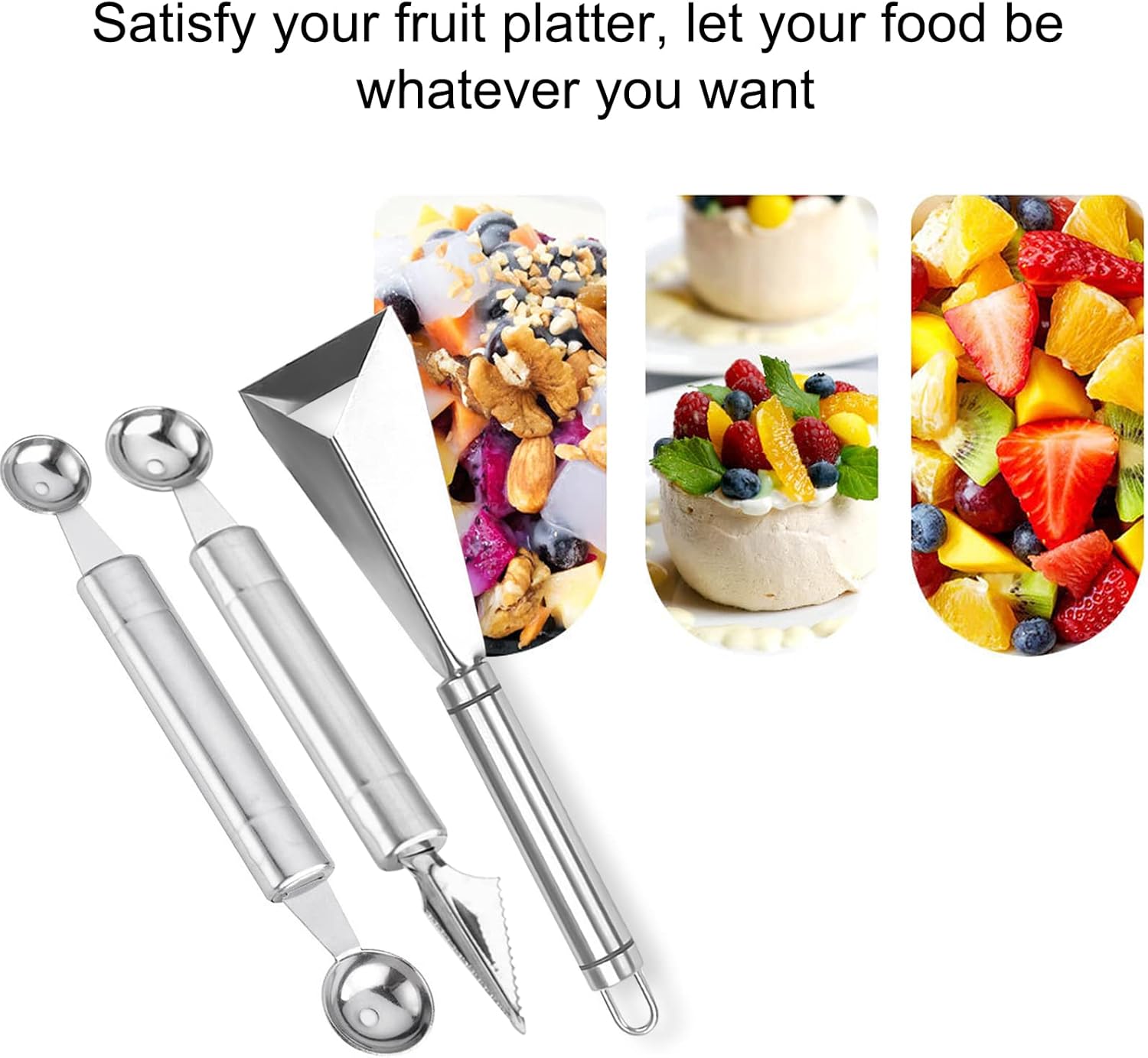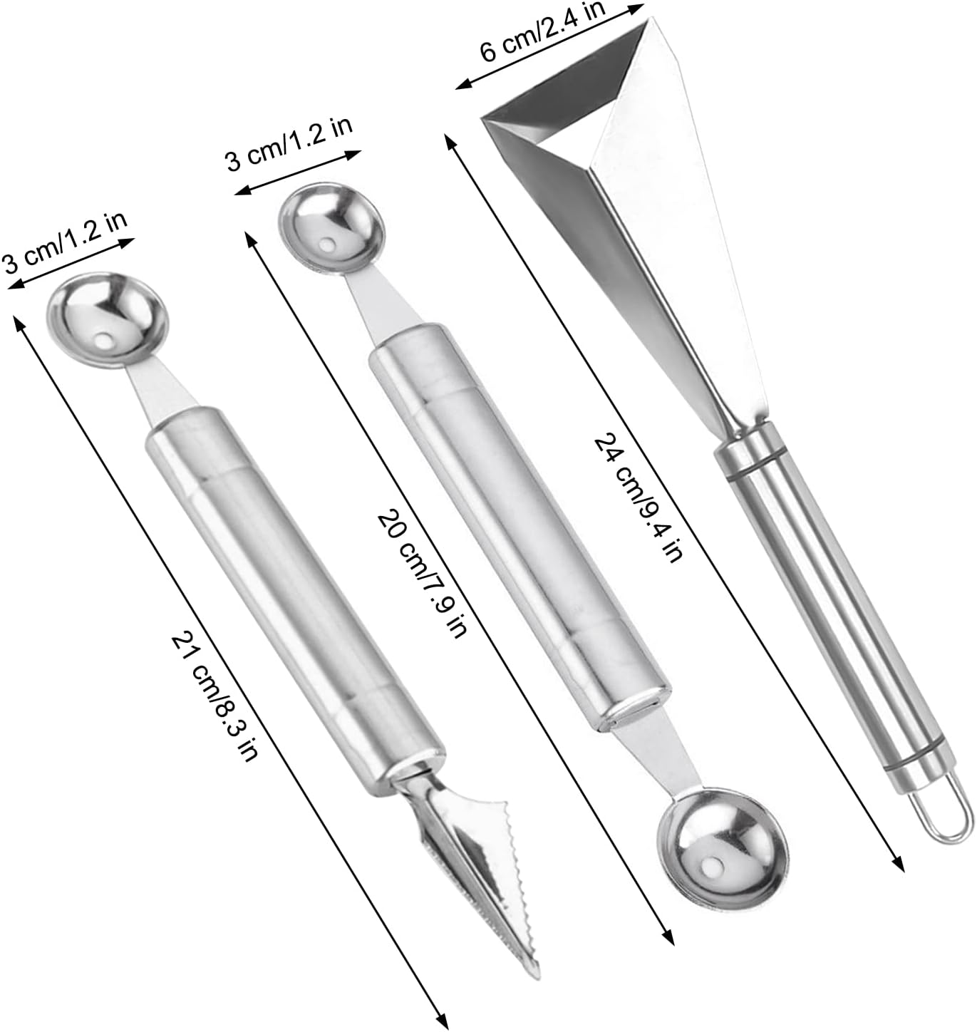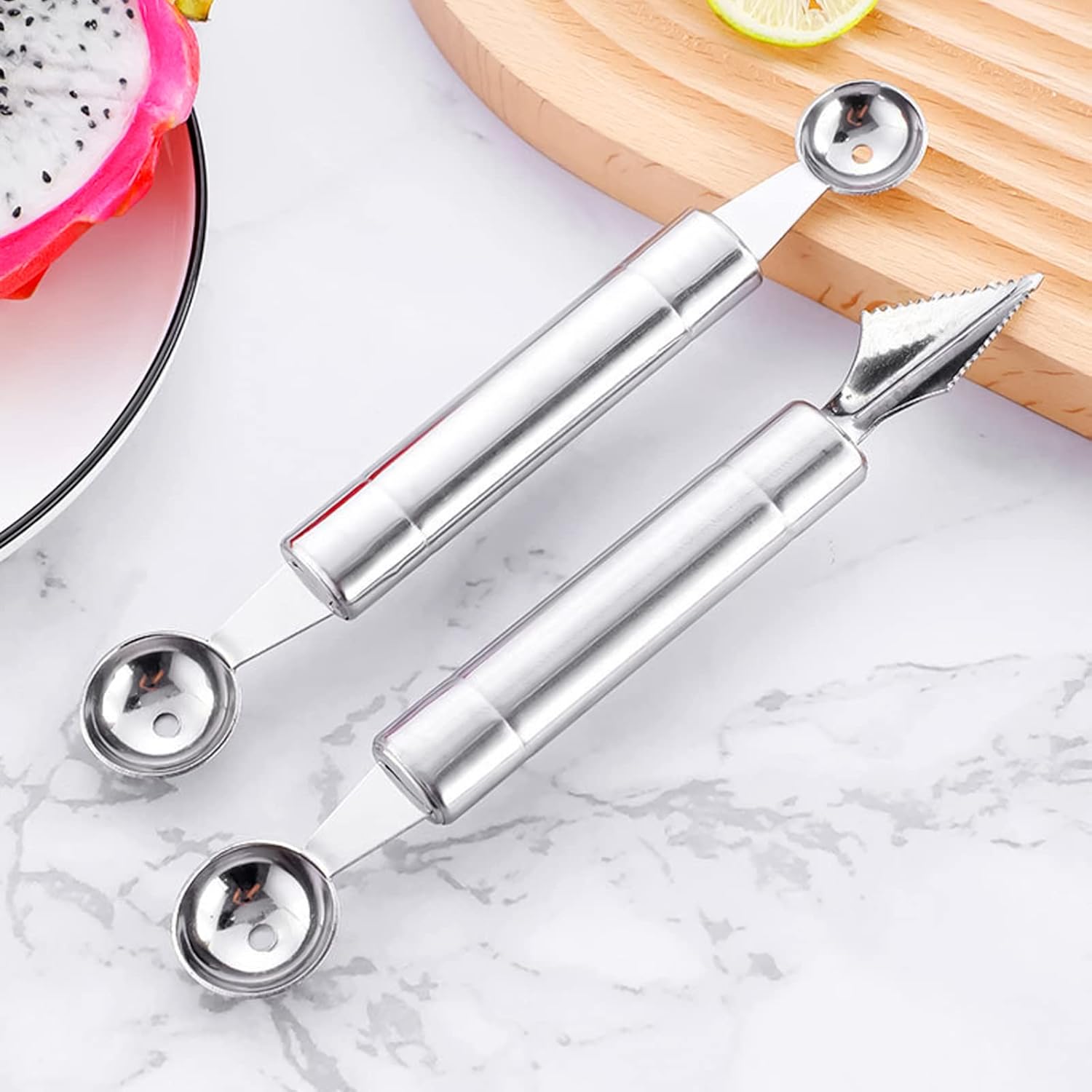 🥭【Double-sided Spoon Design】: The fruit carving tools include two melon ball spoons, and seven sides are V-shaped carving knives with serrations, making cutting easier and faster. The other side is a melon ball spoon, which can make two different sizes of fruit balls.