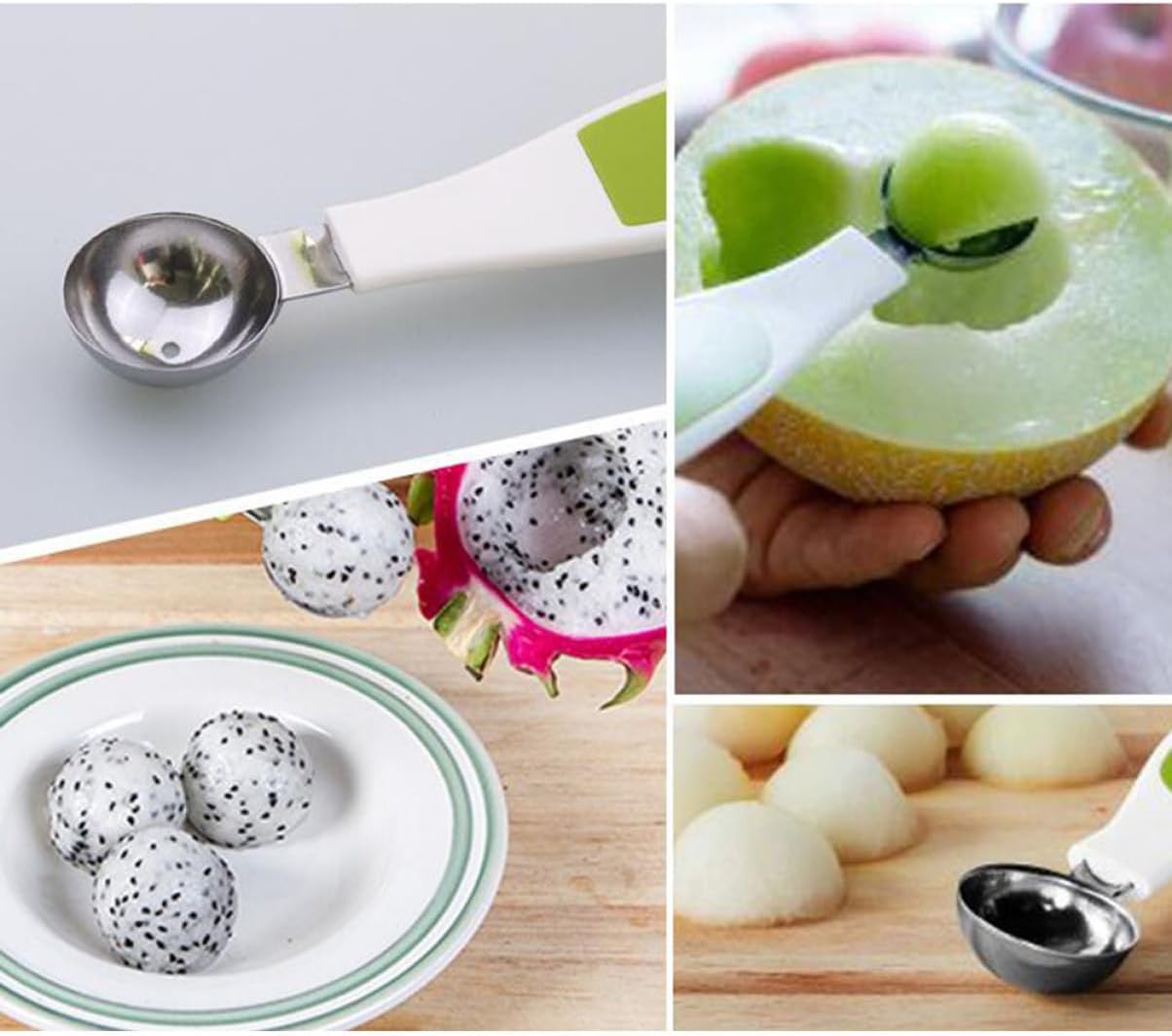 In the middle of the baller there is a small hole, the excess juice can flow out, so that will not affect the shape of the flesh to dig out