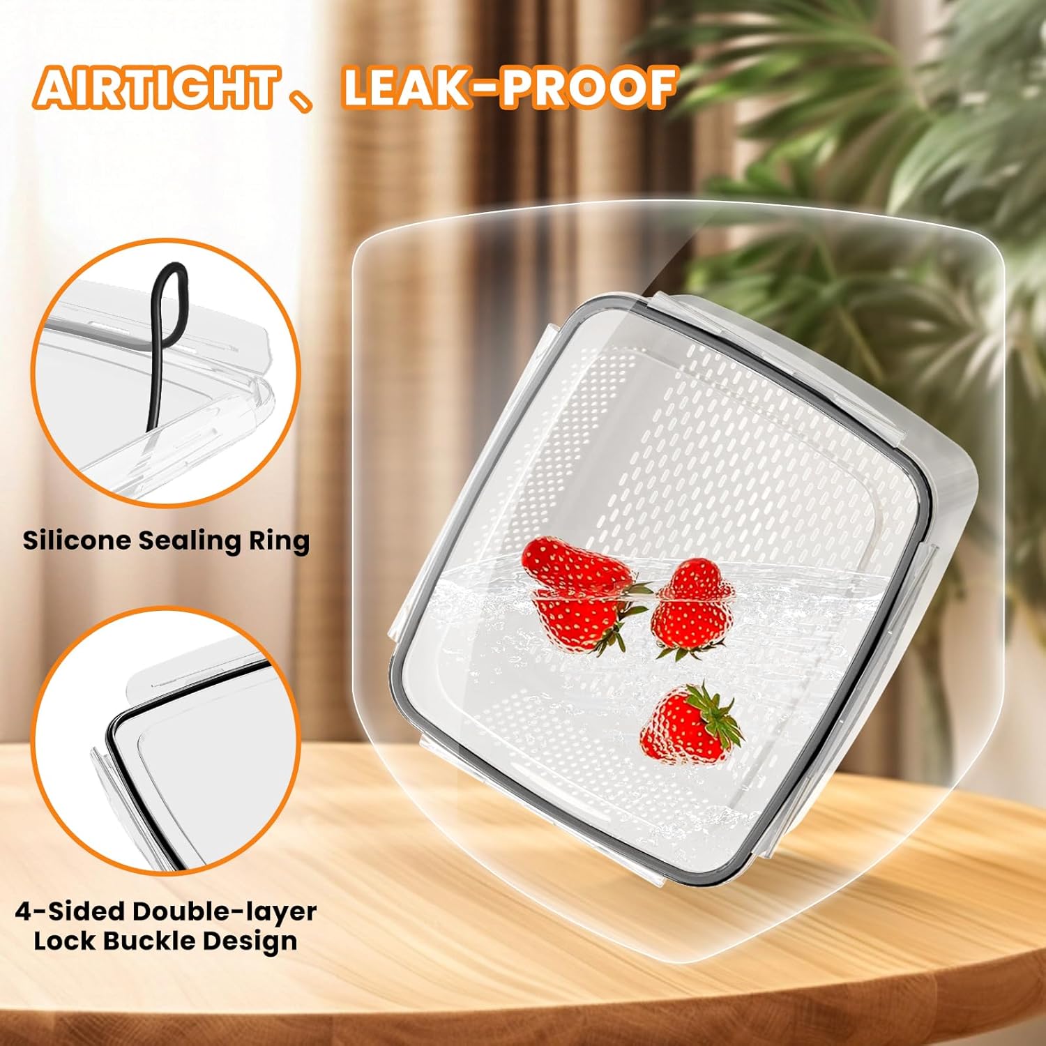 Keep Food Fresh Longer: The storage box is equipped with a drainage basket, which has 5mm high legs at each corner, effectively separating fruits and vegetables from water and preventing them from spoiling due to prolonged soaking; The lid has four reinforced locking buckles and a food-grade silicone ring, providing excellent airtightness to prevent moisture loss in the food and keep our food fresh longer.