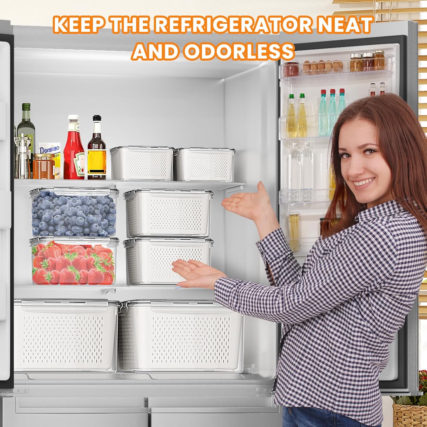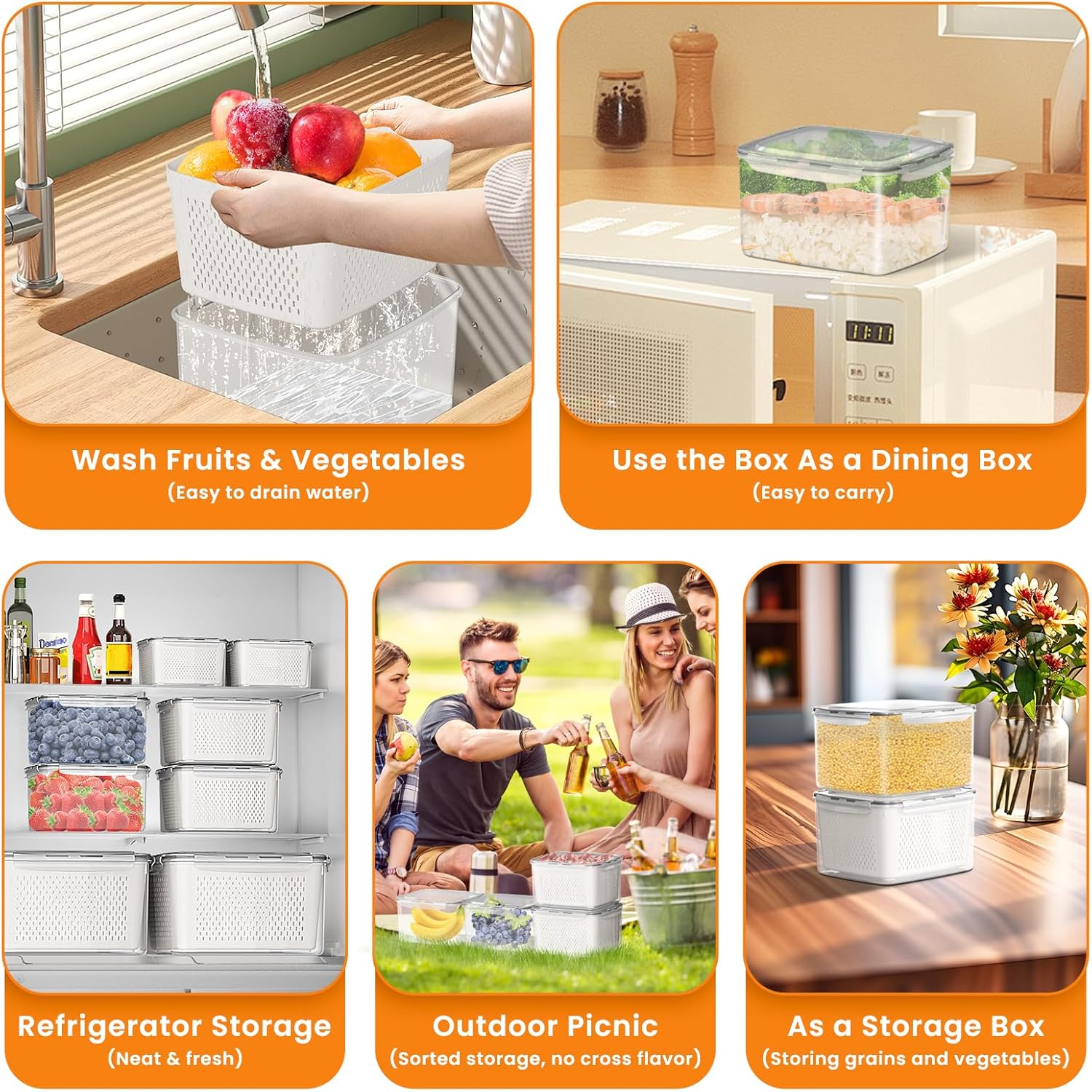 Fruit Containers for Fridge of Different Sizes: Our 5PCS refrigerator fruit storage container includes 5 storage boxes, 5 drain baskets, and 5 sealed lids; The sizes include 380ml/13oz, 800ml/27oz, 1700ml/57oz, 3150ml/106oz, 4150ml/140oz, which can meet our daily storage needs and are suitable for various berries, fruits, vegetables, meats, etc.