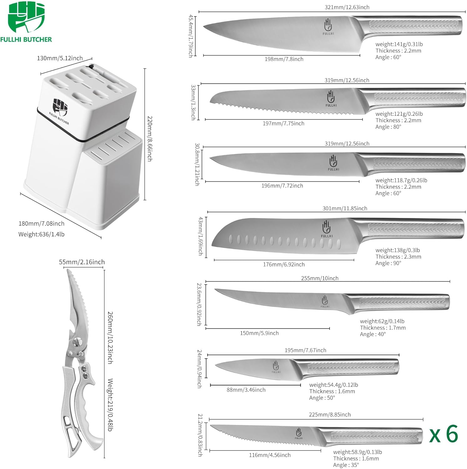 All in One Knife Set – 14 pieces knife set includes: 8″ Chef knife, 8″ Slicing knife, 7″ Santoku knife, 8″ Serrated bread knife, 6″ Boning knife, 3.5″ Paring knife, 6 Pcs 4.5″ serrated steak knife, 1 Pc kitchen shear, and 1 PC Knife Block with built-in Knife Sharpener.