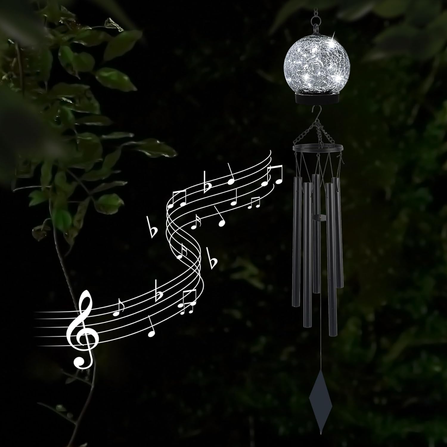 The unique solar wind chimes are designed to add a refreshing and stylish touch to your outdoor. The hanging cracked glass lantern is like a beautiful crystal ball, providing cool white light and a romantic atmosphere for your yard. It is not only a hanging wind chime for outside but also a solar garden light decor. The length of large wind chimes are 42 inches from the top hook to the bottom pendant. The 5 tubes of Windchimes in the center were pinned down from 8.7 inches to 11.8 inches. Prefect garden decor can match different family adornment styles.