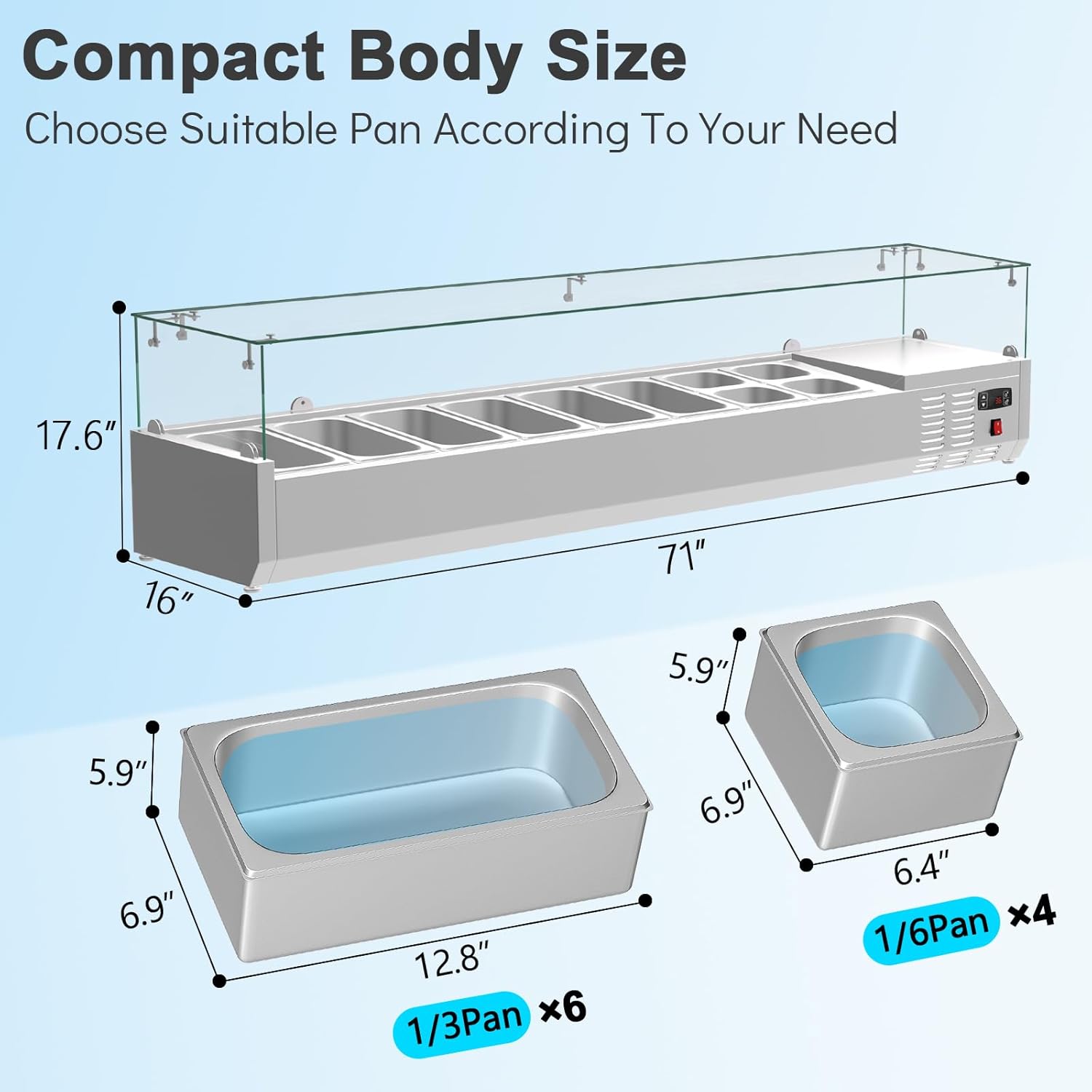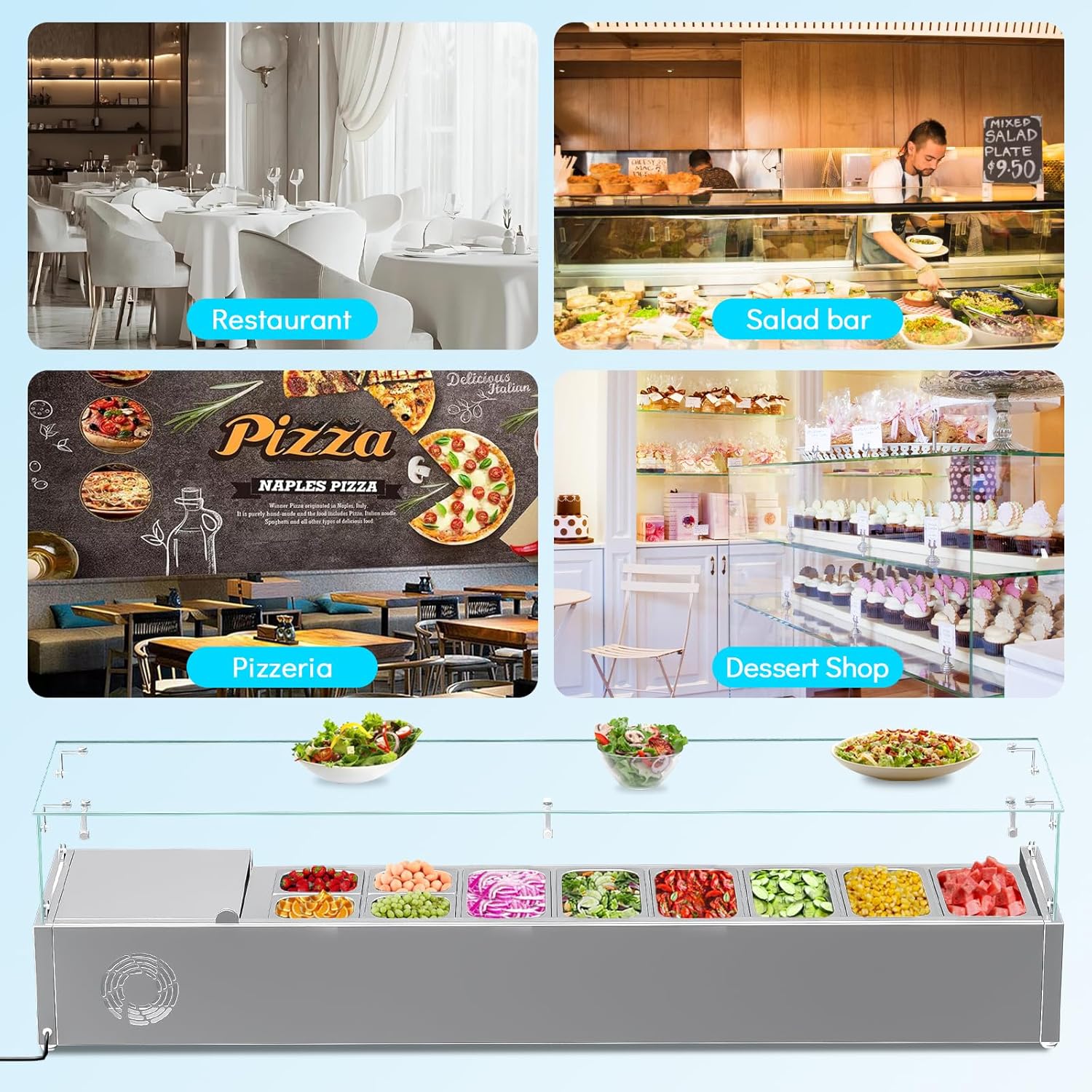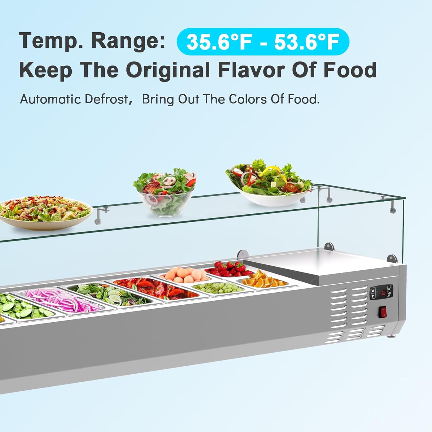 【Removable Tray Design & All Side Tempered Glass】:Equipped with 1/3 Pan*6 and 1/6 Pan*4(Total 53QT),our countertop refrigerated sandwich salad prep table prevent flavor crossover & keep ingredients fresh efficiently by segregating the areas with removable tray.With all side tempered glass,our refrigerated countertop salad bar can fully and clearly display the color of food, which is very suitable for commercial use.