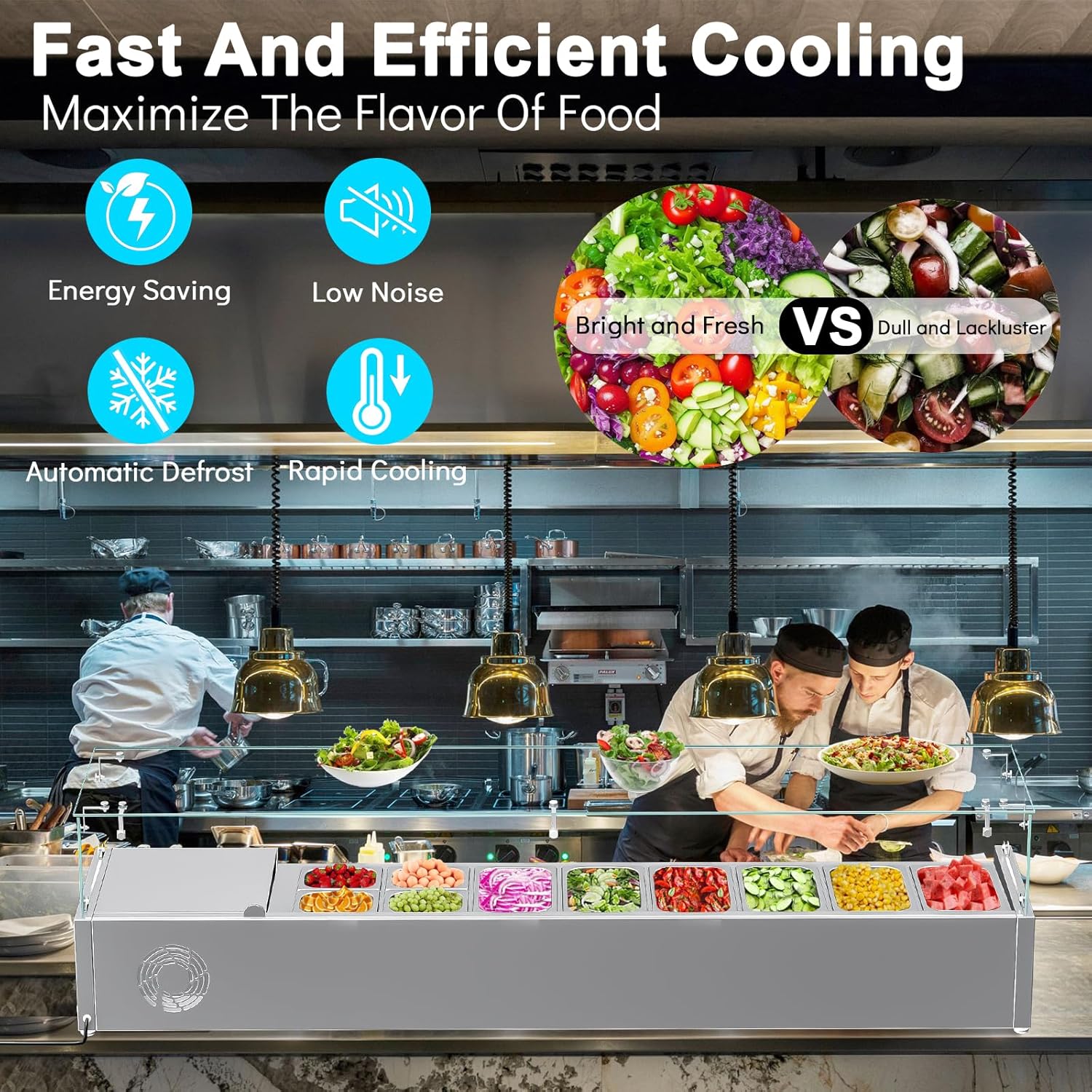 【Energy-saving & Efficient Cooling System】:Equipped with a powerful 170W compressor,our countertop refrigerated condiment station is qualified for temperature control ranging from 2℃ to 12℃(35.6℉ to 53.6℉),which can keep condiments, sandwich toppings, and salad ingredients at the proper temperature.With energy-saving & efficient R290 refrigerant,the sandwich prep table guard provides reliable cooling environment, keep the nutrients and moisture in the food, and ensure the original taste and flav