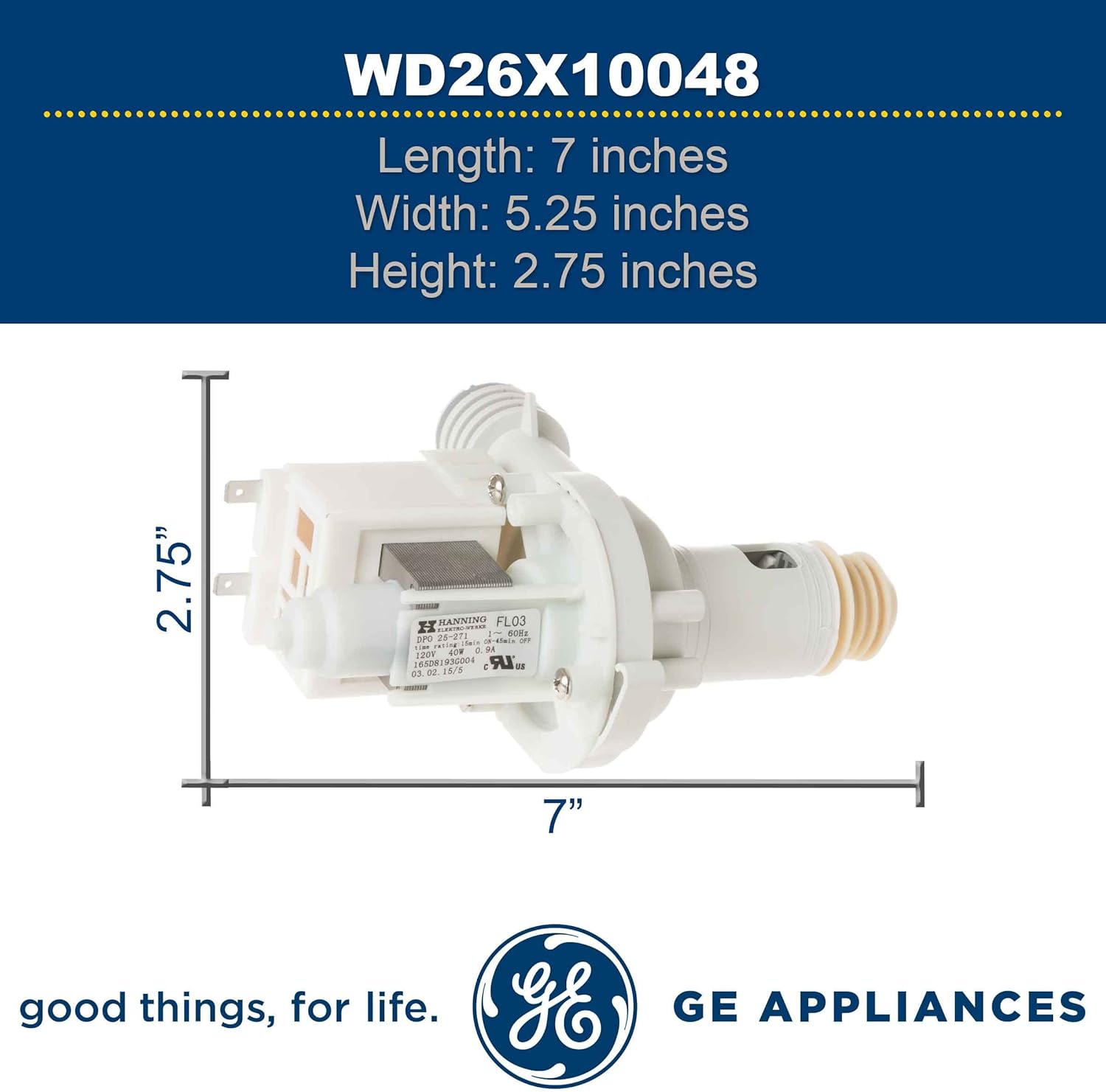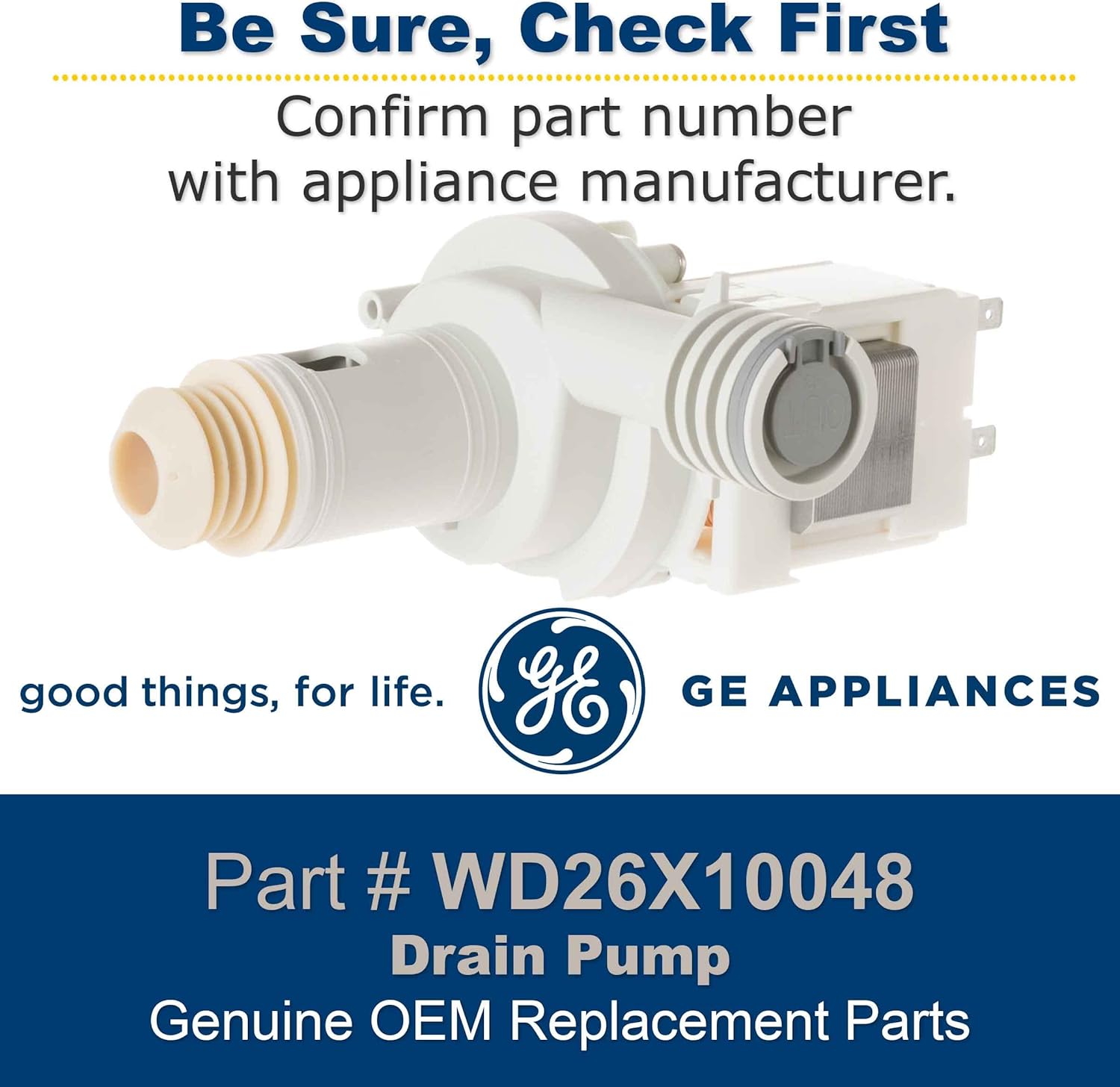 This high quality Genuine OEM GE Appliances Drain Pump Assembly (WD26X10048) removes the water from the dishwasher . The Drain Pump Assembly operates during the drain phase of the dishwashing cycle. Please be aware that it is recommended to disconnect the appliance from all utilities prior to installation of the Drain Pump Assembly.