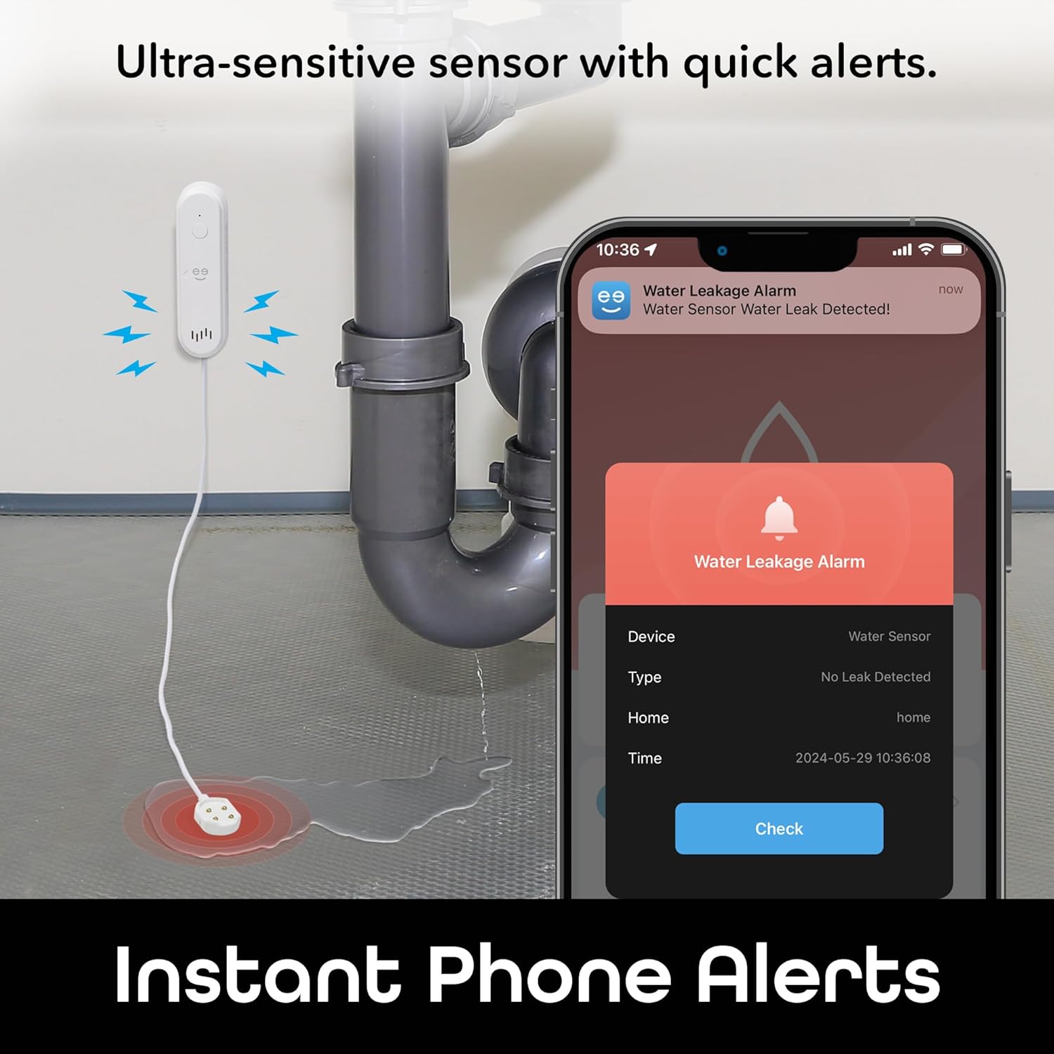 𝗜𝗡𝗦𝗧𝗔𝗡𝗧 𝗔𝗟𝗘𝗥𝗧𝗦 𝗔𝗡𝗗 𝗟𝗢𝗨𝗗 𝗦𝗜𝗥𝗘𝗡: At the first sign of water, receive immediate alerts and a loud 80-decibel siren warning from your home water leak detector enabling swift action to prevent damage.