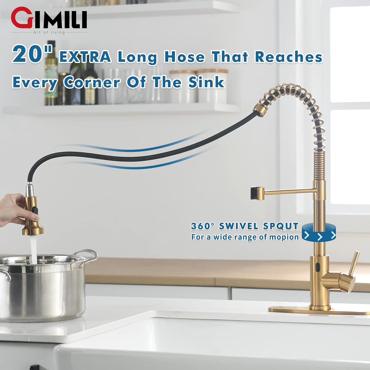 GIMILI Gold Touchless Kitchen Faucet with Pull Down Sprayer Motion Sensor Smart Hands-Free Activated Single Hole Spring Faucet for Kitchen Sink