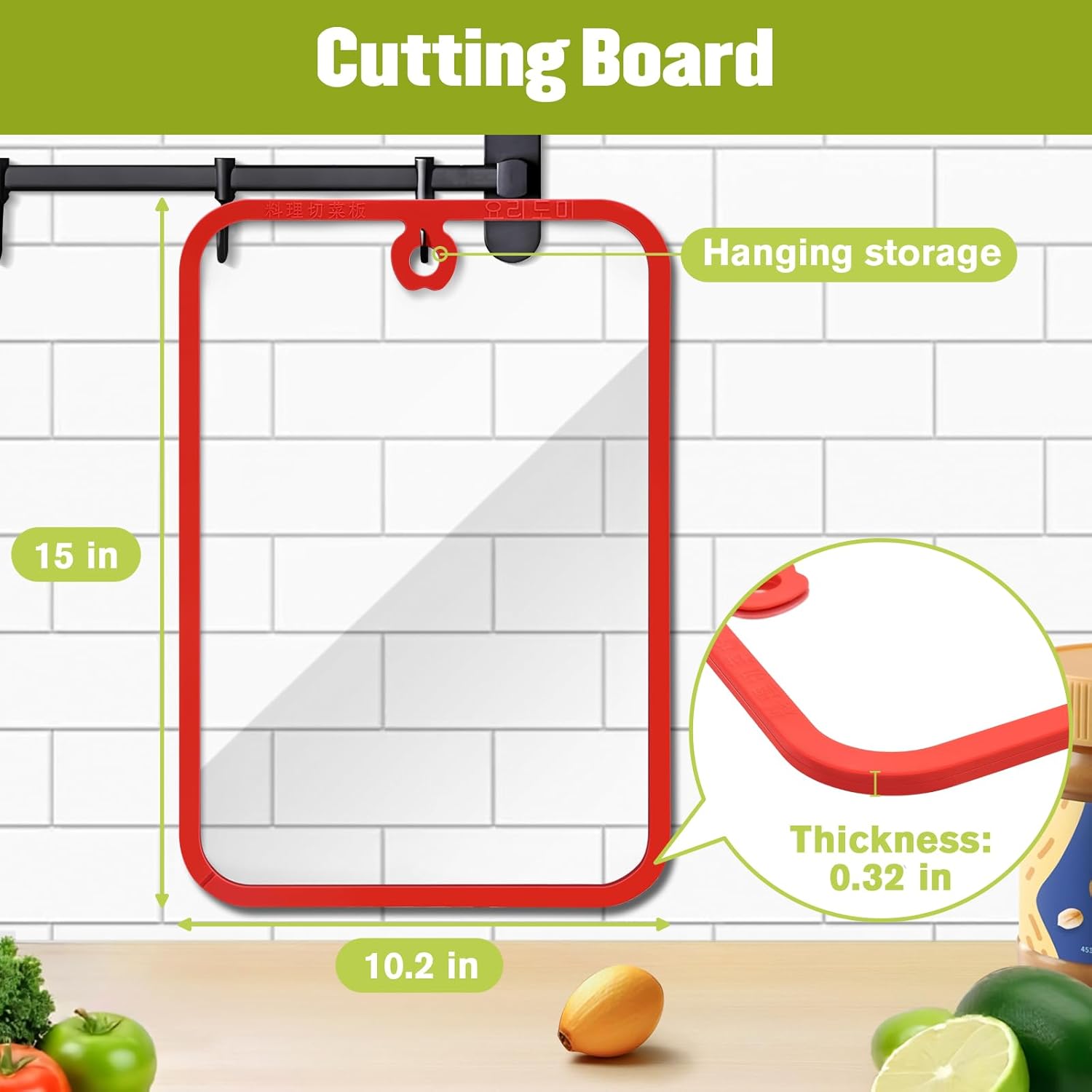 Shatterproof Sturdy Glass:Made from high-strength tempered glass with a thickness of 0.32 inches, this cutting board set is durable, highly resistant to impact, and heat-stable, withstanding temperatures fluctuations up to 572°F (300°C), ensuring long-term use without shattering.Size:15″×10.2″