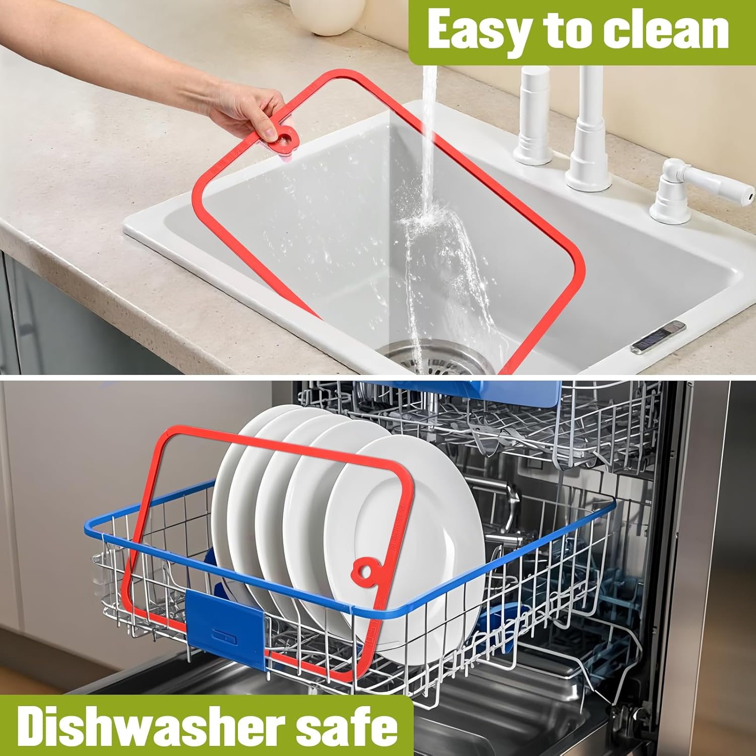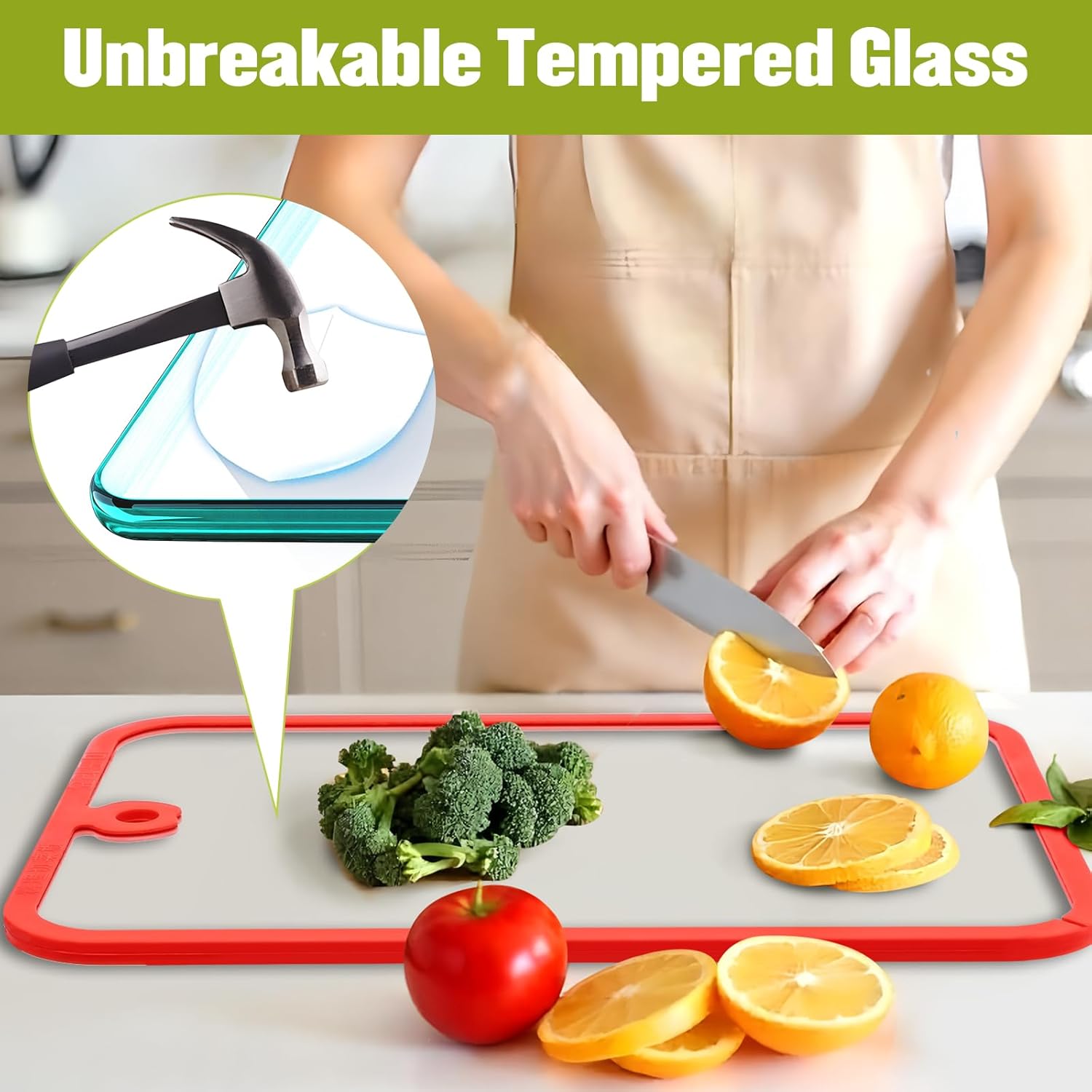Silicone Wrapped Design:Glass cutting boards for kitchen counter with 360° silicone edge provides excellent anti-slip effect to ensure stable chopping and avoid scratching the countertop, as well as the function of anti-spill groove – can effectively collect juice, avoid liquid spillage, and keep the kitchen countertop clean.Designed with hook holes for hanging storage