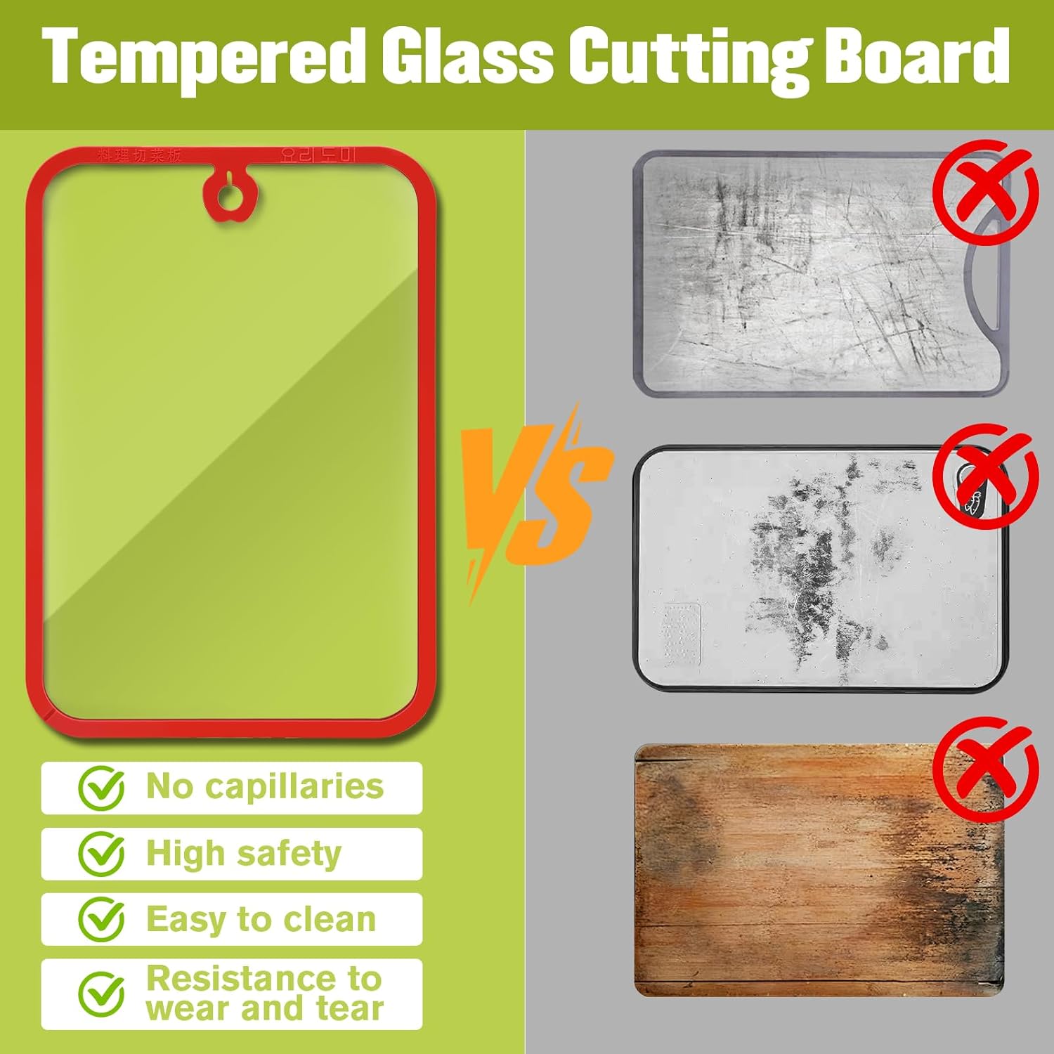 Dishwasher Safe & Easy to Clean:Glass cutting boards for kitchen are more hygienic than traditional wooden and plastic cutting boards, as their smooth, non-porous surface is less likely to retain residue, grease and odors, and avoids food from staining microplastics. It is heat-resistant and dishwasher safe, making it clear and bright