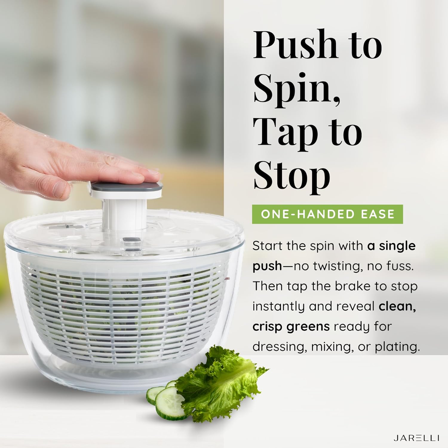 ELEGANT AND DURABLE! The Jarelli bowl of our salad lettuce spinner is constructed from high borosilicate glass easily resisting wear and tear. The food basket, lid, handle, and base are all made from food-grade plastic material and are BPA-free. Enjoy fresh salads with the assurance that your health is a top priority.