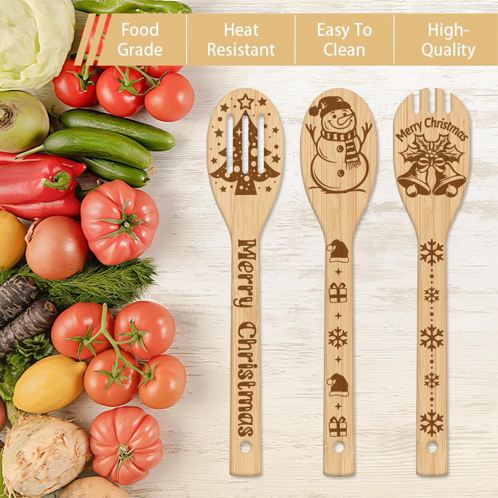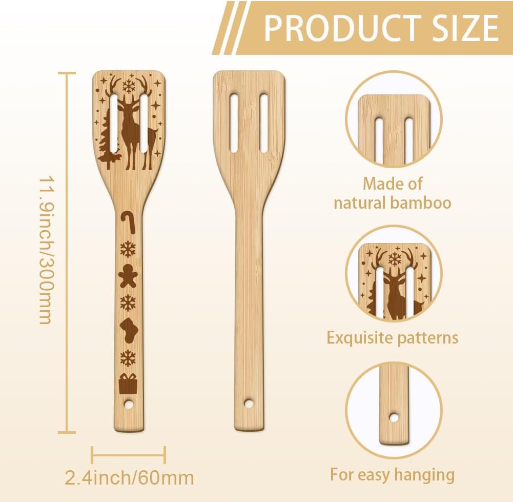 Christmas Engraved Kitchen Cooking Set: 6Pcs 300x60mm/12×2.5inch Christmas themed wooden spoons cooking utensils set include slotted spatula, slotted spoon, soup spoon, forked spatula, single hole spatula and spatula, each style 1pcs. Which is a good helper for you to cook delicious food!