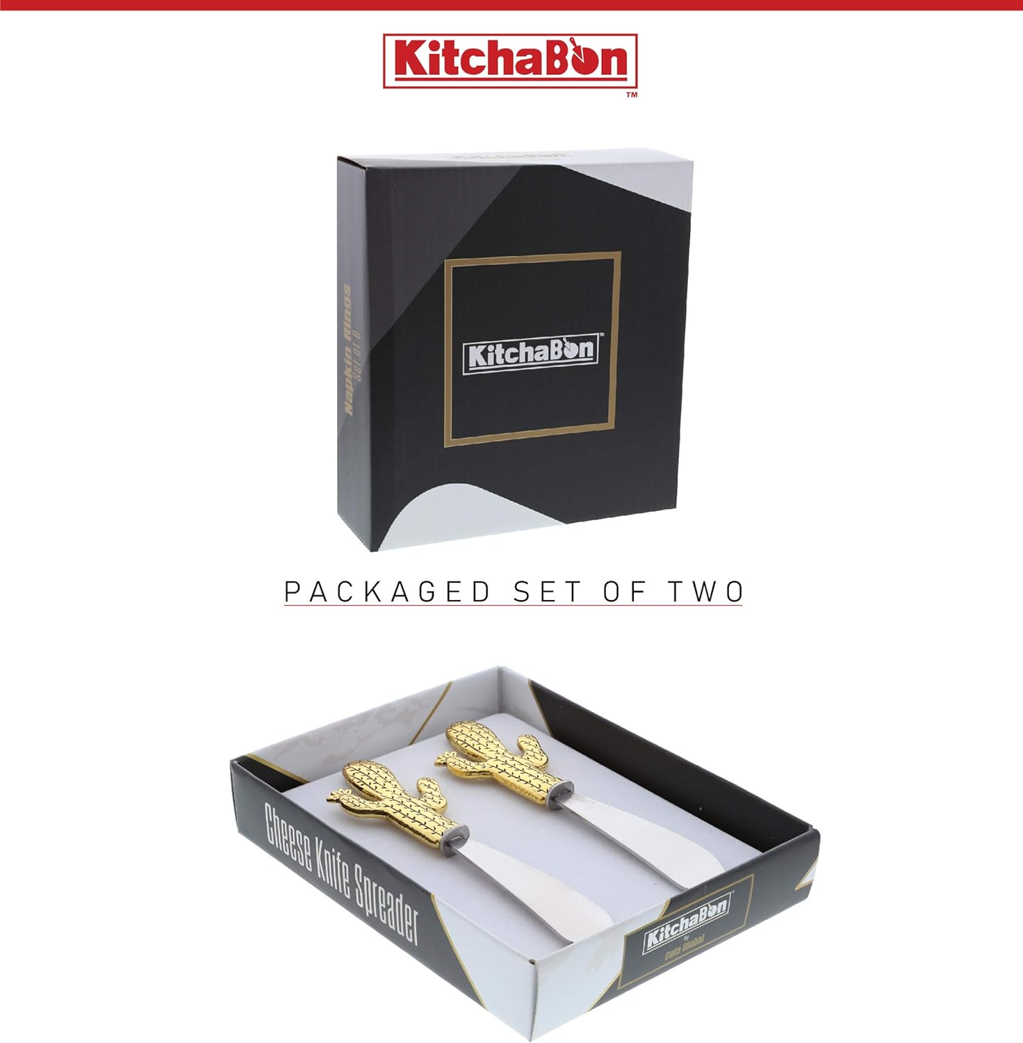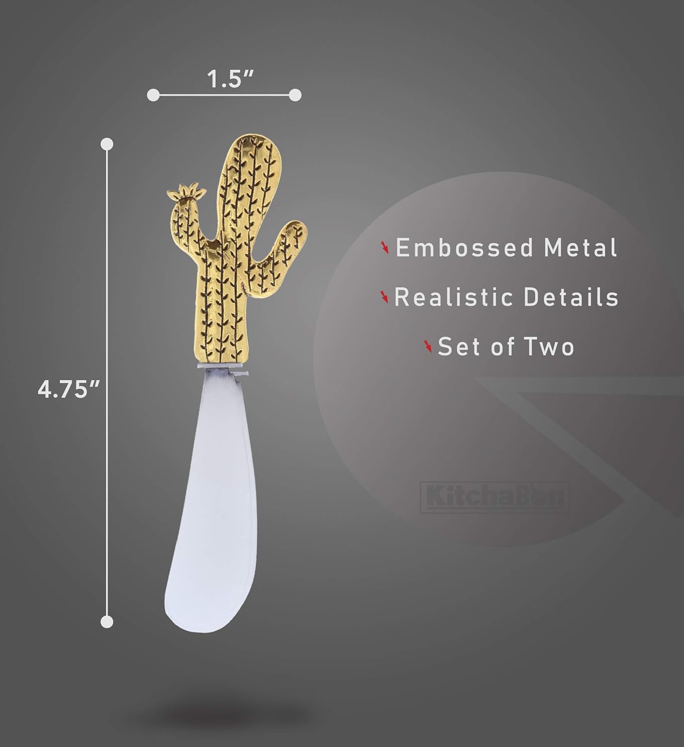 INCLUDED WITH THE PURCHASE OF CACTUS UTENSIL SET – Includes a KitchaBon Golden Cactus Cheese Spreaders Set of 2 that comes in a fancy gift box, arranged perfectly, ready to be given as a wonderful, must-have kitchen tool gift. The appetizer spreaders are decorated with unique handles featuring a golden plant, commonly seen in deserts. Carved with cute little prickly spines. Ideal cactus kitchen accessories & dip spreader for spreadable cheese. Each cheese spreader measures 4.7″ x 1.25″.