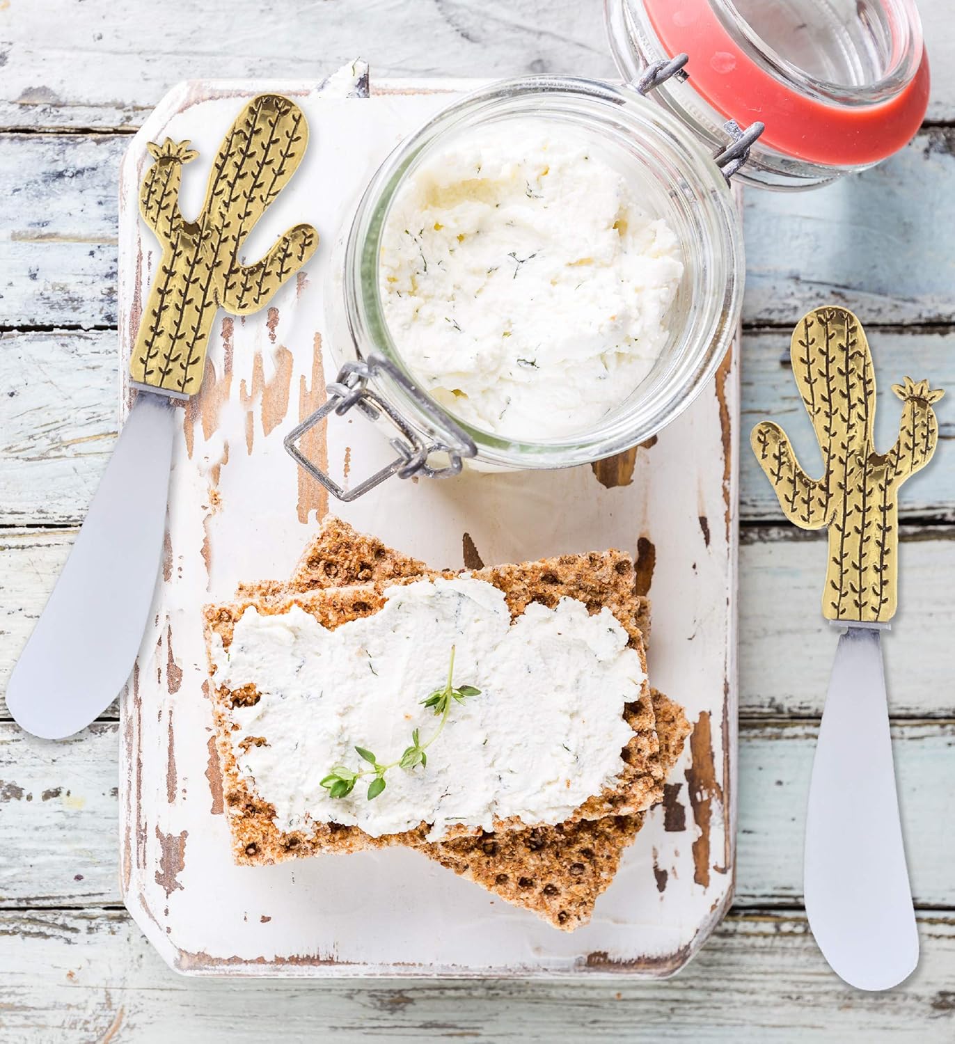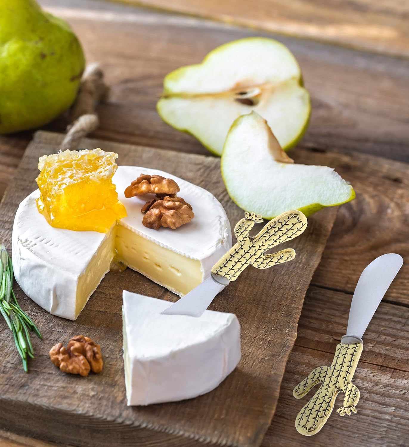 WHO CAN ENJOY UNIQUE SET OF CACTUS CONDIMENT SPREADERS – Great appetizer utensils for hosts of a cheese party, buffet or special dinner with friends & family. Golden handheld spreader kitchen set tools make perfect cheese lovers gifts. Great gift as a house warming present to start a mini kitchen collection. Add this food spreader set to your on-the-go picnic! Appetizer bread making utensils serve as an excellent add to a cheese gift set for mothers who love to prepare irresistible meals.