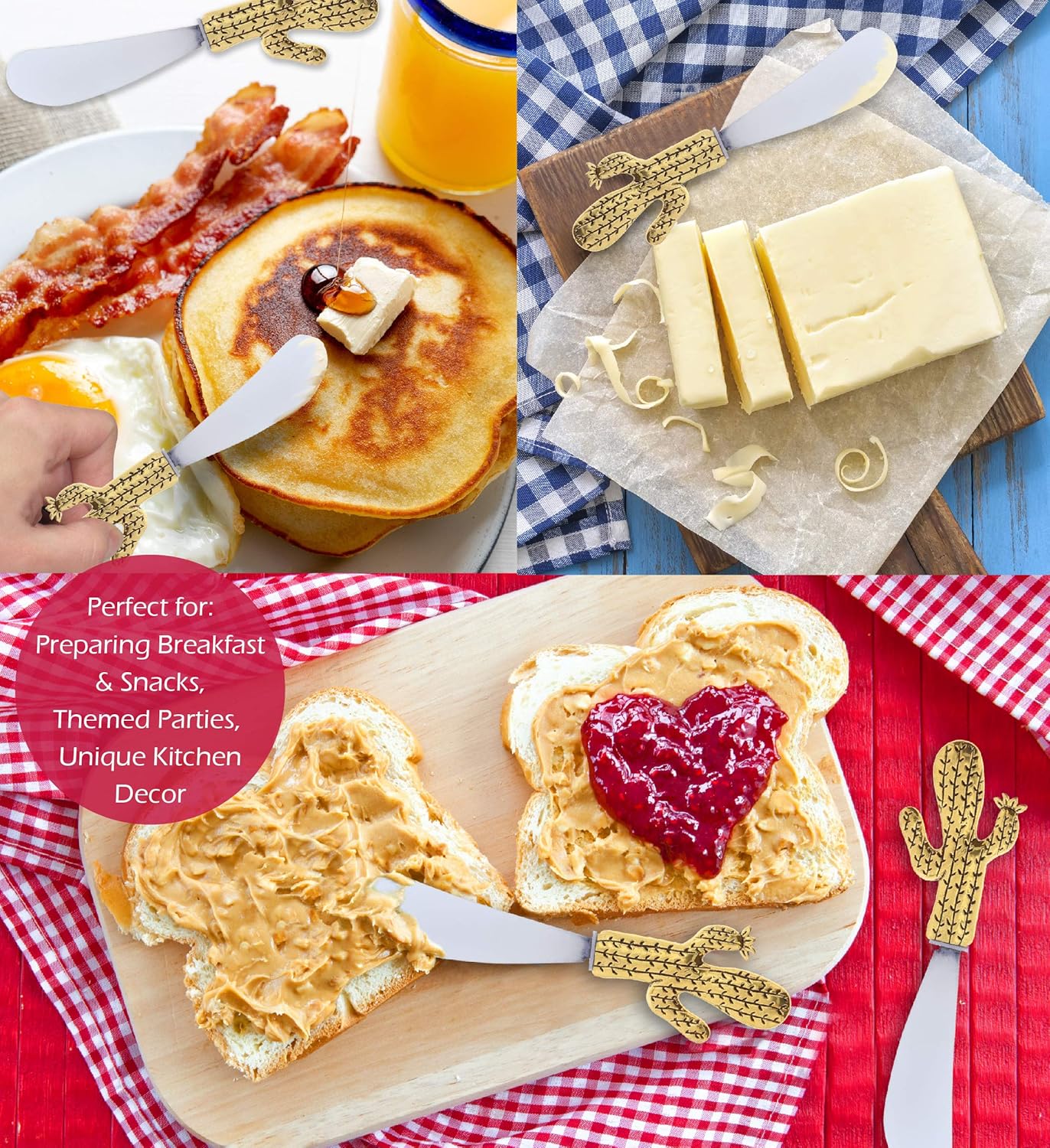 IDEAL USE FOR CACTUS CHEESE SPREADERS – Gold unique handheld tools for applying condiments, dips, & spreads on bread, cookies, sandwich, crackers, waffles, pancakes, toast & more! Prepare your breakfast, snack, lunch, dinner & dessert with a cute cheese spreader set. A decorative dining table accessory to spread cheese, salsa, jam, syrup, butter, honey, icing, margarine, mayo & more on your food elegantly & effortlessly. A condiment spreader can be used as wine and cheese party supplies.
