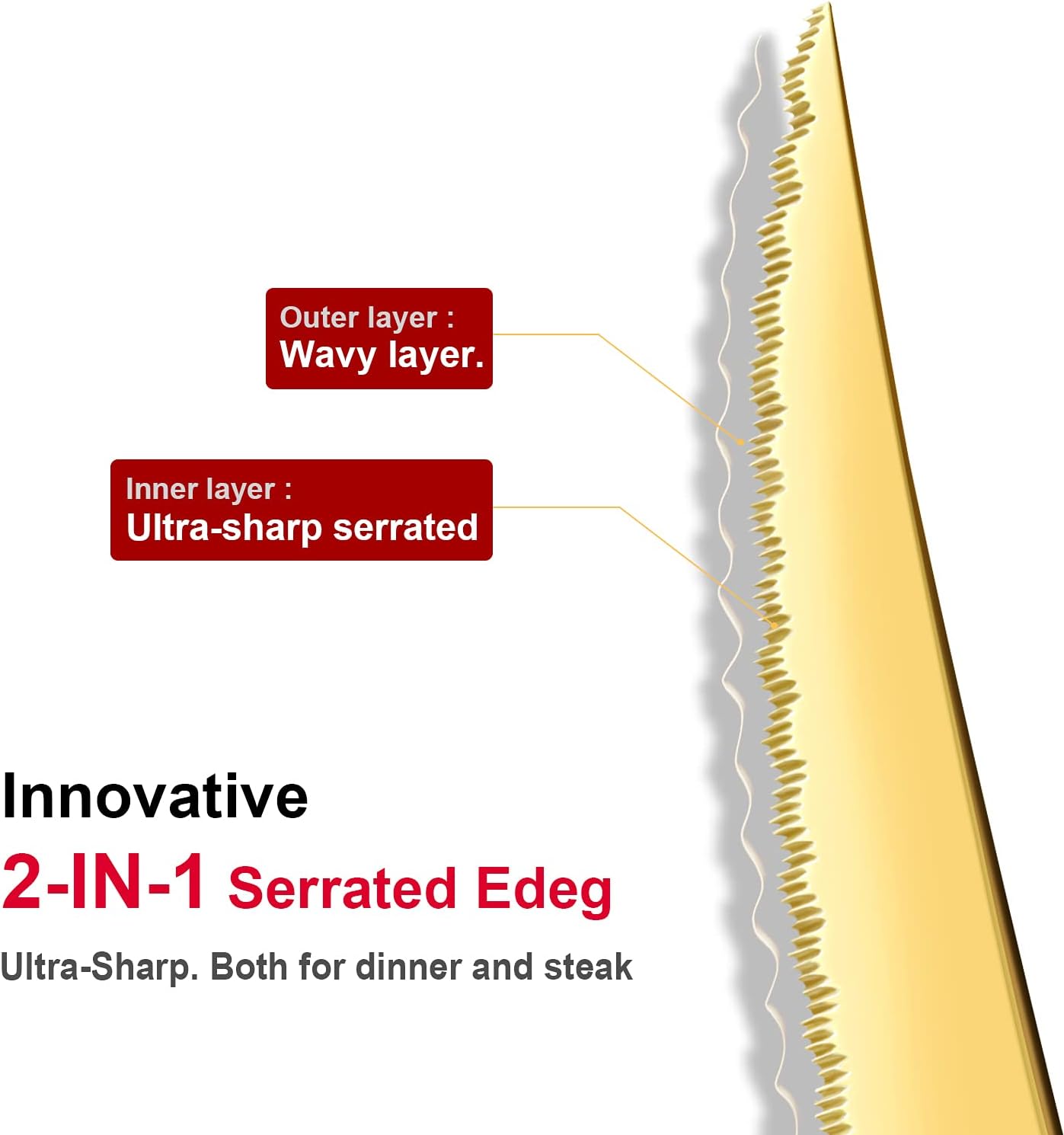 Astonishing Golden Look. Perfect Geometric Lines. Made Of Germany X20CR13 Steel. Ultra-Sharp Serrated Design. Solid Widen Handle Steak Knife. Mirror-polished. Titanium Electrolysis Technology. Dishwasher Safe.